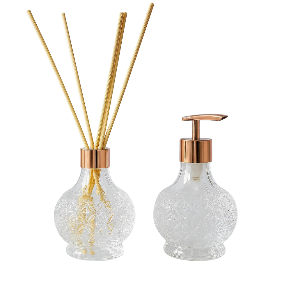 Kit Luxo Lavabo Vidro 210ml - Difusor e Saboneteira Peças Elegantes e Sofisticadas para compor o seu lavabo! Este kit contém: 1 Frasco para Difusor de Ambiente (210ml) em vidro de alta qualidade; 1 Frasco com Saboneteira Líquida (210ml) de vidro, prática e decorativa. 5 und de varetas de madeira 25cm - Ideal para Refil: Customize com seus próprios líquidos e fragrâncias. - Decoração Refinada: Vidro transparente que combina com qualquer ambiente, proporcionando um toque moderno e luxuoso. - Ótima Opção de Presente para quem adora personalizar e deixar o ambiente elegante. 🔗 Adquira já o seu kit e eleve a decoração do seu lavabo!