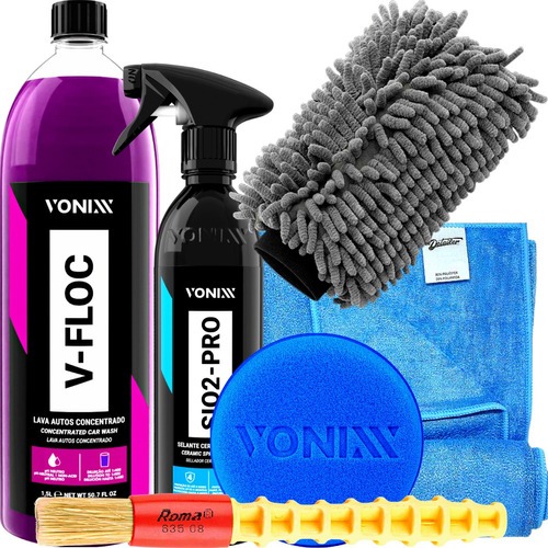 KIT LAVAGEM: 1- SIO2 PRO SELANTE SPRAY VONIXX 1- SHAMPOO V-FLOC 1,5L VONIXX 1- PINCEL ROMA 1- LUVA MICROFIBRA 1- TOALHA SECAGEM JS 1- APLICADOR VONIXX ------------------------------------------------------ SIO2 PRO SPRAY 500ML VONIXX DESCRIÇÃO: Essa composição, promove uma incrível hidrorepelência, e melhora significativamente o acabamento dessas superfícies. O produto deixa um toque aveludado e reduz consideravelmente o coeficiente de atrito, diminuindo as chances de riscos nessas superfícies MODO DE USAR: - Certifique-se que a superfície esteja limpa e seca; - Agite bem o produto antes de usar; - Pulverize uma pequena névoa do produto na superfície em uma área máxima de 60cm x 60cm e faça acabamento utilizando uma Toalha de Microfibra Vonixx limpa e seca virando-a frequentemente até obter o resultado desejado; - Continue fazendo o procedimento até a conclusão total do veículo. - Caso ocorra manchas, repita o procedimento número 3. ------------------------------------------------------------------------------------------------------ SHAMPOO CONCENTRADO V-FLOC 1,5LITROS VONIXX - Shampoo super concentrado com alto rendimento. CARACTERÍSTICAS: - V-Floc é um Shampoo de alta performance e de pH neutro, desenvolvido exclusivamente para o profissional do Car Detail. - Por conter matérias primas de alto padrão tais como agentes condicionadores e tensoativos especiais, proporciona uma lavagem suave e eficiente sem remover ceras ou selantes, sendo perfeito para quem busca qualidade e economia na lavagem do veículo. - Alto rendimento, pois o V-Floc poderá ser diluído em até 1 parte de produto para 400 partes de água. Com 1,5L de produto, poderá ser lavado até 300 veículos de porte pequeno. - Alto grau de lubrificação, essa característica diminui o coeficiente de atrito, fazendo com que a luva de microfibra deslize suavemente sobre a superfície, reduzindo drasticamente as chances de micro riscos na pintura. - Os agentes condicionadores que compõem o produto ajudam na manutenção do brilho, deixando um aspecto de pintura renovada. MODO DE USAR: 1 - Faça uma pré-lavagem do automóvel jogando água para retirada do excesso de sujeira. 2 - Dilua aproximadamente 10ml do produto para 4 litros de água. A quantidade de produto poderá ser alterada para mais ou para menos dependendo no nível de sujeira. 3 - Inicie a lavagem com o auxílio de uma Luva de Microfibra Vonixx, sempre começando pelas partes altas do veículo. 4 - Mergulhe a luva na solução e esfregue suavemente até completar todo o veículo. 5 - Enxague em seguida até a retirada de todo o produto.