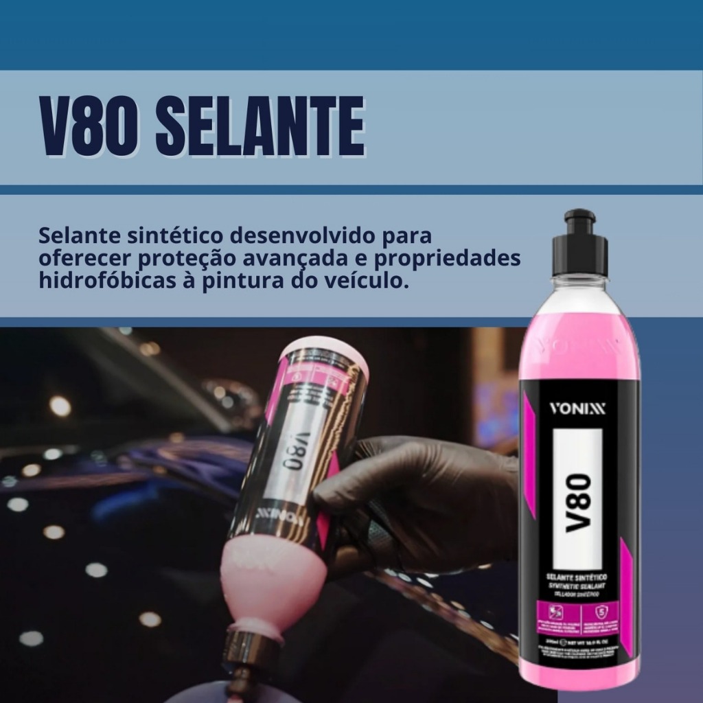 KIT COM: 1- V-FLOC 500ml VONIXX 1- V-MOL 500ml VONIXX 1- V80 500ml VONIXX 1- LUVA MICROFIBRA DUPLA AÇÃO 1- TOALHA 40X40 305GSM VONIXX --------------------------------------------------------------------------------------------------- V-FLOC 500ml VONIXX V-FLOC é um lava autos de alta performance e de pH neutro. Sua fórmula contém agentes condicionadores e tensoativos especiais que proporcionam uma lavagem suave e eficiente. V-FLOC tem alto grau de lubrificação, promovendo redução significativa do coeficiente de atrito, proporcionando um melhor deslize da luva de microfibra e reduzindo de forma efetiva as chances de microrriscos na pintura. V-FLOC também promove brilho e aspecto de renovação da pintura. DILUIÇÃO: 1:20 – Uso na Snow Foam 1:400 – Lavagem comum com balde MODO DE USO: 1- Realizar a pré-lavagem do veículo para retirada do excesso de sujeira; 2- Diluir aproximadamente 10ml de V-FLOC em 4 litros de água; Ajustar a quantidade de produto de acordo com o nível de sujeira; 3- Iniciar a lavagem com o auxílio de Luva de Microfibra, sempre começando pela parte superior do veículo; 4- Mergulhar a luva na solução e esfregar suavemente, até completar todo o veículo; 5- Enxaguar em seguida até a retirada de todo o produto; 6- Utilizar a Toalha de Secagem para finalizar. ------------------------------------------------------------------------------------------------------V-MOL 500ml VONIXX V-Mol é um lava autos biodegradável com pH levemente básico que não agride a superfície. Ideal para lavagem de automóveis, em especial para remoção de sujeiras mais difíceis, como remoção de barro e óleo. Agora com aroma cereja intensa! DILUIÇÃO: Sujeira leve/manutenção: 1:100 Sujeira Média: 1:50 Sujeira pesada 1:10 - DILUIR O PRODUTO NA PROPORÇÃO INDICADA. - INICIAR A LAVAGEM COM O AUXILIO DE UMA LUVA DE MICROFIBRA, SEMPRE COMEÇANDO PELAS PARTES SUPERIORES DO VEÍCULO. - MERGULHAR A LUVA NA SOLUÇÃO E ESFREGAR SUAVEMENTE ATÉ COMPLETAR O VEÍCULO. - ENXAGUAR EM SEGUIDA ATÉ A RETIRADA DE TODO O PRODUTO. - SECAR O VEÍCULO POR COMPLETO A FIM DE EVITAR MANCHAS. ------------------------------------------------------------------------------------------------------ V80 500ml VONIXX O V80 é um selante sintético desenvolvido para oferecer proteção avançada e propriedades hidrofóbicas à pintura do veículo. Sua fórmula exclusiva auxilia na eliminação de pequenas imperfeições e proporciona um brilho profundo e molhado à pintura. MODO DE USO: 1. Agitar bem o produto antes de usar; 2. Aplicar pequena quantidade do produto usando aplicador de espuma, realizando movimentos circulares e uniformes; 3. Aguardar secar por no mínimo 15 minutos para que o produto atinja o ponto de cura; 4. Remover o produto utilizando toalha de microfibra limpa e seca até obter um brilho impecável.