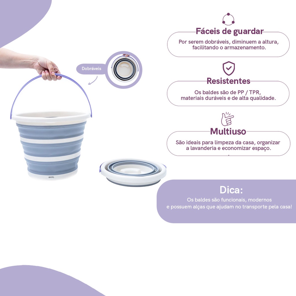 Conheça o Kit Lavanderia com 2 baldes dobráveis de plástico de 10L da Simplo. Multiuso, resistentes e fáceis de guardar, são ideais para organizar a lavanderia e economizar espaço. Possuem alça para facilitar o transporte, são retráteis com aros estruturados e diminuem a altura em até 5 vezes! É de PP / TPR. Limpe bem e seque a bacia antes de guardar. Evite deixar no sol ou perto de outras fontes de calor. Não use com água sanitária e outros produtos que contenham cloro, removedores, produtos à base de petróleo ou líquidos oleosos. Leve funcionalidade e modernidade para sua casa! O kit contém: 2 baldes dobráveis de plástico 10L