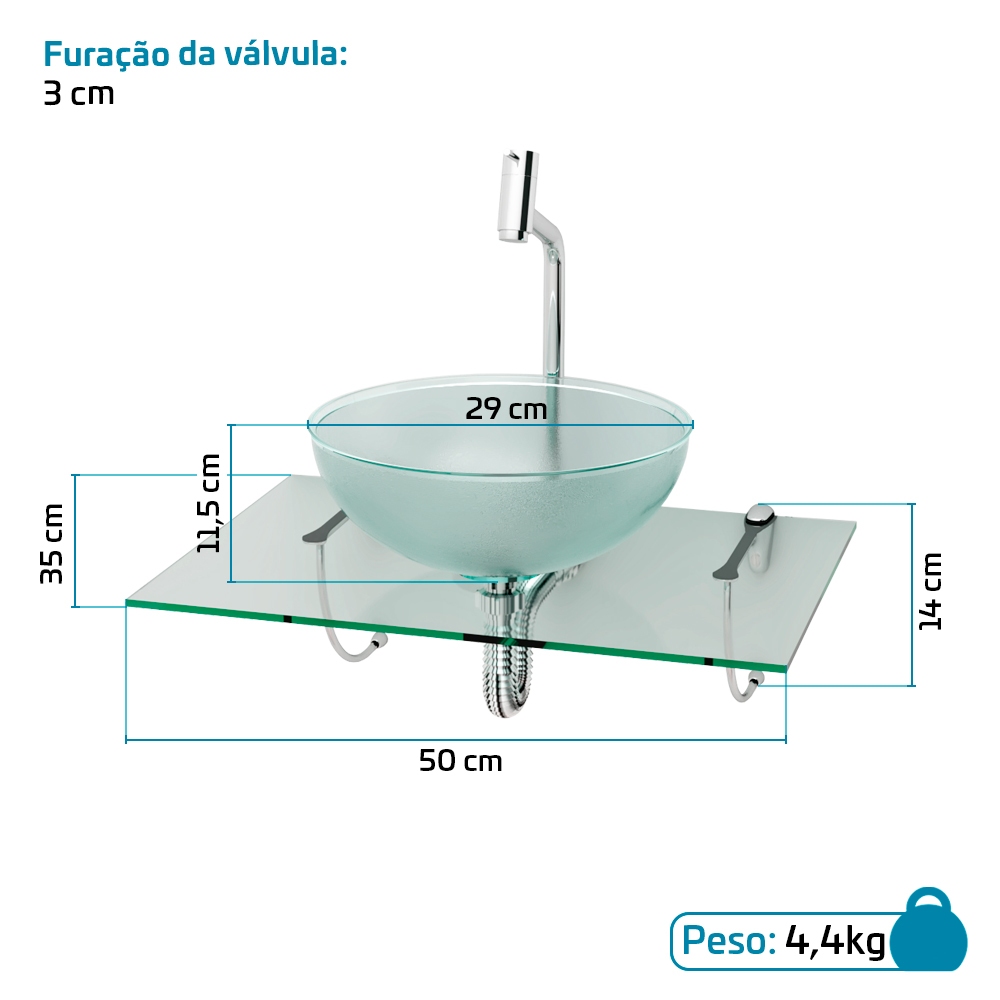 KIT LAVATÓRIO CUBA E TAMPO DE VIDRO + SUPORTE + TORNEIRA LINK BICA ALTA + VÁLVULA 7/8 + SIFÃO METALIZADO + ENGATE BELTEMPO. O kit lavatório da Beltempo é a escolha ideal para você, o tampo de vidro temperado, e a cuba de apoio em vidro texturizado, conferem um visual moderno e sofisticado, além disso os suportes cromados de metal complementam o design, garantindo durabilidade e elegância, além disso o kit possui todos os acessórios de instalação, válvula padrão 7/8”, sifão metalizado e engate flexível, ideal para quem busca a solução completa. PRINCIPAIS CARACTERÍSTICAS: - Embalagem com proteção extra para transporte. - Produto de alta qualidade com excelente acabamento. - Tampo de vidro temperado - Suportes resistentes e com regulagem de abertura. - Cuba de vidro moderna e elegante - Torneira de alta qualidade com bica móvel acionamento ¼ de volta e arejador. - Válvula em metal resistente, garantindo maior durabilidade. - Sifão em peça única evitando vazamentos. - Engate flexível resistente e anticorrosivo, compatível com diversos tipos de instalação. ITENS INCLUSOS: - 01 Tampo de vidro temperado. - 02 Suporte de parede cromado. - 01 Cuba de vidro redonda. - 01 Torneira link bica alta 45° cromada. - 01 Válvula padrão 7/8” cromada - 01 Sifão metalizado - 01 Engate flexível cromado INFORMAÇÕES TÉCNICAS: - Marca BELTEMPO TAMPO DE VIDRO PARA CUBA BELTEMPO: - Vidro: Temperado - Cor: Incolor - Espessura: 6mm - Medidas do tampo: 50 x 35 cm - Furação de torneira: 3,5cm - Furação para válvula: 4cm - Canto: Agudo - Peso: 2,625 kg SUPORTE REGULÁVEL FLAMINGO CROMADO BELTEMPO: - Fixação: Tampo de vidro - Fabricado em: zamac/ haste de alumínio - Acabamento: Cromado - Regulagem de abertura: 6 a 38mm - Sustentação total: 20 kg/unidade - Profundidade: 300mm. - Comprimento: 201mm - Largura: 27mm - Altura da base: 166mm - Obs.: A distância de fixação entre os suportes deve ser aproximadamente 400mm. CUBA DE APOIO REDONDA VIDRO R29 CRISTAL BELTEMPO - Modelo: Apoio (Sem Abas) - Material: Vidro - Cor: Incolor - Acabamento interno: Liso - Acabamento externo: Texturizado - Diâmetro: 29 cm (Variação +/- 2 mm) - Altura: 11,5 cm (Variação +/- 2 mm) - Peso: Aproximadamente 1.500 g (Podendo variar +/- 200 g) - Espessura: 6 mm (Podendo variar +/- 0,5 mm) - Furo para válvula: Compatível com a válvula 7/8’’. TORNEIRA BANHEIRO MESA BICA ALTA 45° METAL CROMADA BELTEMPO - Tipo: Mesa Link Bica Alta - Acionamento: Manual 1/4 de volta - Material: Metal - Acabamento/cor: Cromado - Bica móvel com giro 360°. - Bitola da rosca de entrada de água: G ½’’ - Água fria. - Arejador: Sim - Acompanha: Canopla, rosca de fixação e anel de vedação. - Altura Total: 43,0 cm - Altura da Bica: 28,5 cm - Avanço Da Bica: 14,2 cm. - Largura: 1,5 cm - Furo de Instalação: 3 cm - Peso: 259g VÁLVULA PADRÃO 7/8" RALO CUBA PIA METAL CROMADA BELTEMPO - Tipo: Padrão - Material: Metal - Acabamento/cor: Cromado - Bitola da rosca de saída: 7/8’’ - Acompanha: Rosca de fixação, arruela, anel de vedação e tampa. - Altura da rosca: 6,8 cm - Diâmetro superior (encaixe na pia): 5,7 cm - Diâmetro Inferior: (rosca de saída): 3,0 cm - Furo de Instalação: 3,5 cm - Peso: 78 g SIFÃO SANFONADO 72CM UNIVERSAL METALIZADO BELTEMPO - Material: Polipropileno - Cor: Metalizado - Resistente à temperaturas de -20°C à +90°C - Comprimento mínimo: 37cm - Comprimento máximo: 72cm - Entradas: 1" (29,5mm), 1.1/4" (42mm), 1.1/2" (48mm) - Saídas: DN 38mm, DN 40mm, DN 48mm, DN 50mm ENGATE FLEXIVEL MANGUEIRA 40CM AÇO INOX CROMADA BELTEMPO - Tipo: Convencional - Material: Aço Inox - Acabamento/cor: Cromado - Bitola das roscas de entrada de água: G 1/2’’ - Água fria. - Acompanha: Canopla. - Comprimento: 40 cm - Peso: 113 g GARANTIA: Cuba e tampo de vidro BELTEMPO - 6 MESES / Torneira, válvula e acessórios BELTEMPO - 12 MESES DICA DE LIMPEZA: Para limpar o kit utilize um pano macio. Se necessário, use detergente ou sabão neutro com um pano umedecido. Enxágue bem e seque com um pano seco. (Nunca utilize palha de aço, produtos abrasivos, químicos ou solventes para a limpeza). A Beltempo possui uma linha completa de cubas, torneiras, válvulas, sifões e engates flexíveis. Consulte-nos para mais informações! DÚVIDAS FREQUENTES: 1. Qual o material da torneira? A torneira é feita de metal. 2. Essa torneira serve para lavatórios e pias padrão? Sim, ela foi projetada para ser compatível com pias e lavatórios padrão, encaixando-se perfeitamente em lavatórios comuns. 3. A torneira possui misturador para água quente e fria? A torneira não possui sistema de misturador quente e frio. 4. O bico da torneira é móvel? O bico é fixo, garantindo um design estável e minimalista. 5. A bica da torneira é móvel? Sim, a bica é móvel em 360°, garantindo praticidade no dia a dia. 6. A torneira economiza água? Sim, graças ao arejador embutido, a torneira reduz o consumo de água sem comprometer o fluxo, tornando-a uma opção econômica e sustentável. 7. Funciona bem em sistemas de baixa pressão?