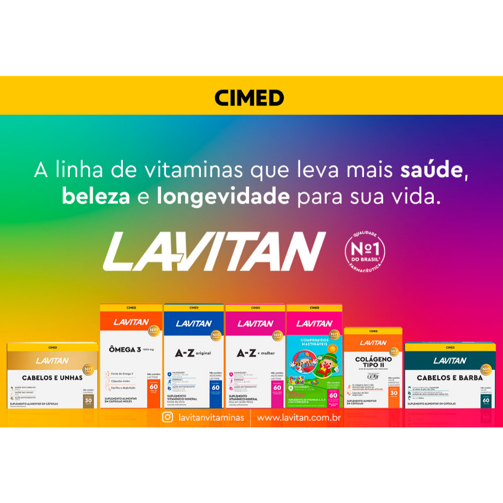 O Lavitan é um suplemento vitamínico indicado para o bom funcionamento do organismo feminino. Composto por Vitaminas: A, B1, B2, B3, B5, B6, B12 C, Ácido Fólico, Ferro, Manganês e Zinco.O uso de Lavitan A-Z mantém os níveis de vitaminas e minerais que o corpo necessita diariamente, além de atuar como poderoso antioxidante, auxiliar no sistema imunológico, manter a saúde da pele, unhas e cabelos.Lavitan Mulher, auxilia no fortalecimento do sistema imunológico, além de cabelos e unhas. O produto possui ação antioxidante, auxilia no fortalecimento da imunidade, promete melhorar a aparência da pele, além de deixar cabelos e unhas mais fortes. A vitamina mais completa para as mulheres.