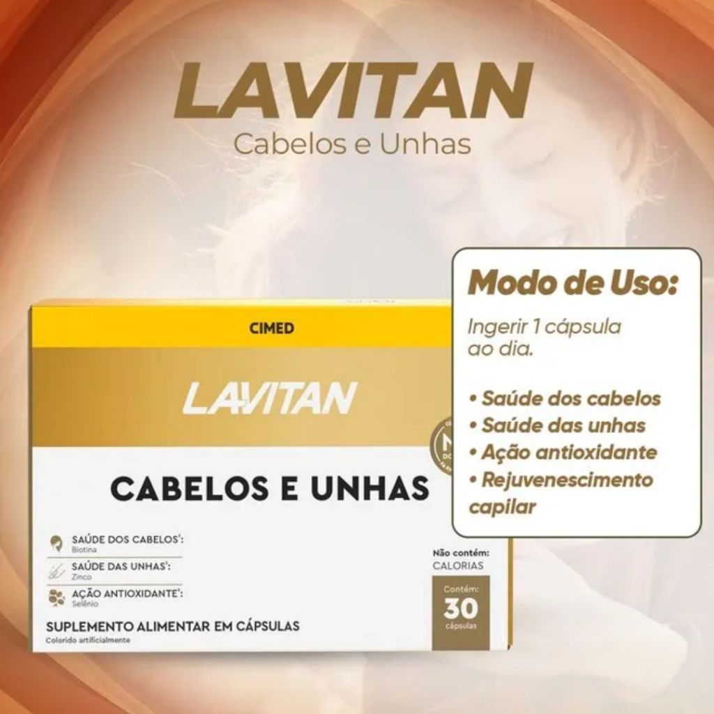 Kit Tônico Rapunzel Lola + Lavitan Cabelos e Unhas 60cps Tônico capilar de crescimento e antiqueda. Lola Cosmetics Rapunzel é um tratamento que reduz a perda de fios, dando força extra e saúde. O Tônico do Crescimento Lola Cosmetics Rapunzel é de uso contínuo e age no fortalecimento do folículo para que a raiz fique mais resistente e os fios tenham uma vida mais longa. Dessa forma o ciclo de crescimento do cabelo volta ao normal, evitando a queda constante e gradual. Potencialize a sua rotina de cuidados capilares com essa fórmula potente de Lola From Rio e tenha o cabelão que você sempre sonhou! O que é a Vitamina para Cabelos e Unhas Lavitan? Lavitan Cabelos e Unhas é um suplemento vitamínico-mineral adulto - para homens e mulheres - que auxilia no crescimento saudável e fortalecimento de cabelos e unhas. Possui ação antioxidante e é rico em Vitamina B6, B7 e zinco. Para que serve a Vitamina para Cabelos e Unhas Lavitan? Cabelos quebradiços e unhas fracas podem ser sinais de falhas vitamínicas no organismo. Lavitan Cabelos e Unhas é indicado para reposição vitamínica, com uma fórmula especial de vitaminas que colaboram com o fortalecimento e crescimento saudável dos cabelos e unhas. Benefícios Rejuvenescimento capilar. Cabelos e unhas saudáveis. Ação Antioxidante. Zero calorias. Componentes e como atuam Vitamina B7 (Biotina): contribui para a produção de queratina, um dos componentes mais importantes do cabelo e unhas. Vitamina B6: ajuda a prevenir a queda de cabelo, proporcionando um crescimento de fios mais saudáveis e fortes. Selênio: importante fortalecedor de cabelo e unhas e, por isso, a carência deste mineral pode levar a queda de cabelo e tornar as unhas fracas e quebradiças. Além disso, tem um elevado poder antioxidante. Cromo: mineral que melhora o metabolismo das proteínas, como a queratina. Zinco: contribui para a manutenção do crescimento normal do cabelo e das unhas, já que participa na síntese de queratina, que é a proteína principal do cabelo e unhas. Ingredientes Sulfato de zinco, Selenato de Sódio, Cloridrato de Piridoxina, Picolinato de Cromo, Biotina, Estabilizante Croscarmelose, Veículo Lactose e Antiumectante Dióxido de Silício. Alérgicos NÃO CONTÉM GLÚTEN. CONTÉM LACTOSE. CONTÉM DERIVADOS DE LEITE. A lista de ingredientes usados na composição pode ser alterada pelo fabricante. Desta forma, recomendamos que você sempre leia a lista de ingredientes na embalagem do produto para garantir que são adequados para seu uso Como usar Vitamina para Cabelos e Unhas Lavitan? Tomar uma cápsula ao dia ou conforme determinação do seu médico. Quem não deve usar Vitamina para Cabelos e Unhas Lavitan? Este suplemento não deve ser usado em pessoas com hipersensibilidade a qualquer um dos componentes da fórmula, crianças com idade inferior a 3 anos, gestantes e lactantes, a não ser por recomendação médica. Existem efeitos colaterais com o uso de Lavitan Cabelos e Unhas? Lavitan Cabelos e Unhas é um suplemento bem tolerado, não tendo sido relatados efeitos colaterais.