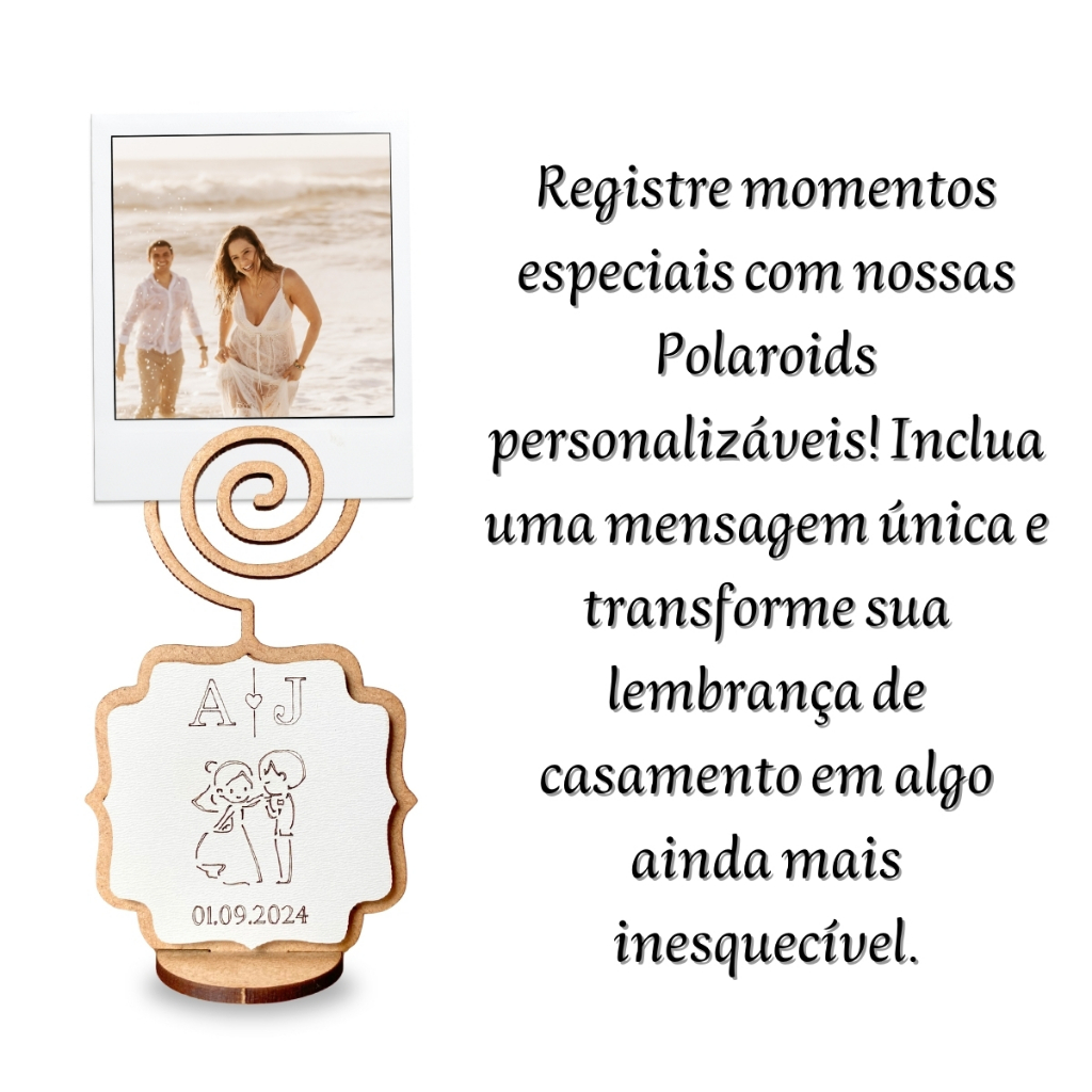 ATENÇÃO : Nos envie mensagem antes de realizar a compra para alinhar as modificações !! Imortalize os melhores momentos do seu casamento com nossas Polaroides personalizáveis. Cada foto vem com a possibilidade de incluir uma mensagem especial, criando uma lembrança exclusiva e cheia de afeto para os seus convidados. Transforme cada detalhe da sua celebração em uma recordação única e personalizada que será guardada para sempre. ------------------------------------ MEDIDAS DO PRODUTO: 7 CM de cumprimento. 12 CM de altura. MATERIAL: MDF 3mm cru e branco ------------------------------------ OBSERVAÇÕES: - A tonalidade da cor do produto pode variar de acordo com a resolução da tela - O produto é enviado desmontado para evitar danos durante o transporte e reduzir o custo do frete! - Montagem simples e de encaixe; (se achar necessário usar cola branca de boa qualidade, não acompanha) - Cuidados especiais: Não deixar em contato direto com a água, limpar somente com um pano levemente umedecido. ------------------------------------ SOMOS A MIZOCK! COMPRANDO CONOSCO A QUALIDADE É GARANTIDA.