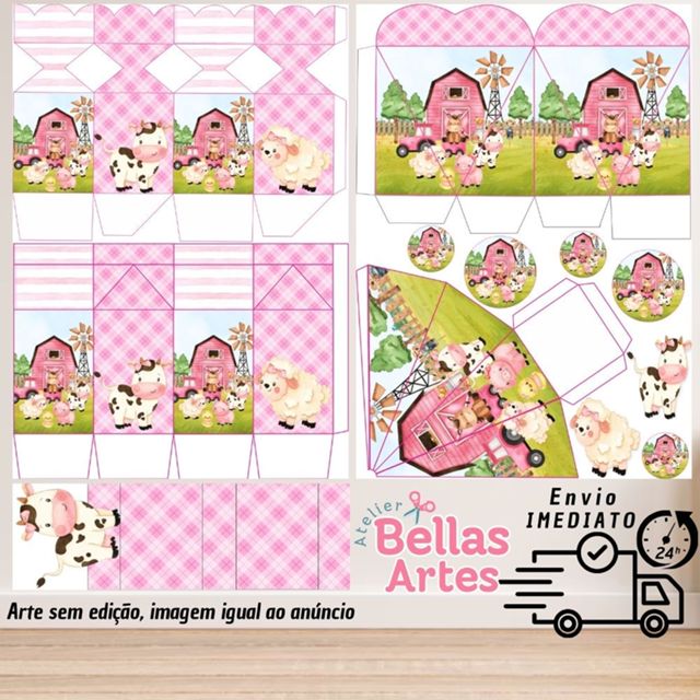 LEIA COM ATENÇÃO Arte de acordo com imagem do anúncio: FAZENDINHA ROSA Pedidos finalizados antes 12hs envio no mesmo dia. Obs: Válido somente para dias úteis. KIT CONTÉM 80 ITENS ⬇️KIT SEM ALTERAÇÃO E ARTE PADRÃO DA LOJA, CONTENDO: 05 CAIXAS CORAÇÃO (11CM) 05 CAIXAS MEIA BALA (11CM) 05 CAIXAS PIRÂMIDES (12CM) 05 CAIXA MILK (11CM) 05 CAIXAS BIS DUPLO 10 TAGS PARA LATINHAS (5CM) 10 PARA TUBETES (5CM) 35 TAGS PARA DOCINHO (3CM) KIT CONTÉM 160 ITENS ⬇️KIT SEM ALTERAÇÃO E ARTE PADRÃO DA LOJA, CONTENDO: 10 CAIXAS CORAÇÃO (11CM) 10 CAIXAS MEIA BALA (11CM) 10 CAIXAS PIRÂMIDES (12CM) 10 CAIXA MILK (11CM) 10 CAIXAS BIS DUPLO 20 TAGS PARA LATINHAS (5CM) 20 PARA TUBETES (5CM) 70 TAGS PARA DOCINHO (3CM) OBSERVAÇÕES: SÃO FOLHAS PARA RECORTE (cliente recorta, dobra e cola). PRODUZIDO EM PAPEL FOTOGRÁFICO 180G; KIT SEM SUBSTITUIÇÕES DE ITENS; NÃO ACEITAMOS CANCELAMENTOS PÓS COMPRA; NÃO PERSONALIZAMOS COM NOME E IDADE; ENVIAMOS VÍDEO ILUSTRATIVO DE COMO MONTAR (solicitar no chat). IMPORTANTE SABER: As cores das fotos podem não representar fidelidade, podendo sofrer pequenas alterações por causa do monitor de cada computador, as cores podem variar de acordo com o brilho e contraste do seu monitor. Por se tratarem de produtos artesanais e únicos, podem ocorrer pequenas variações. As medidas porém sofrem pequenas diferenças em relação ao corte entre 1 e 2 milímetros.