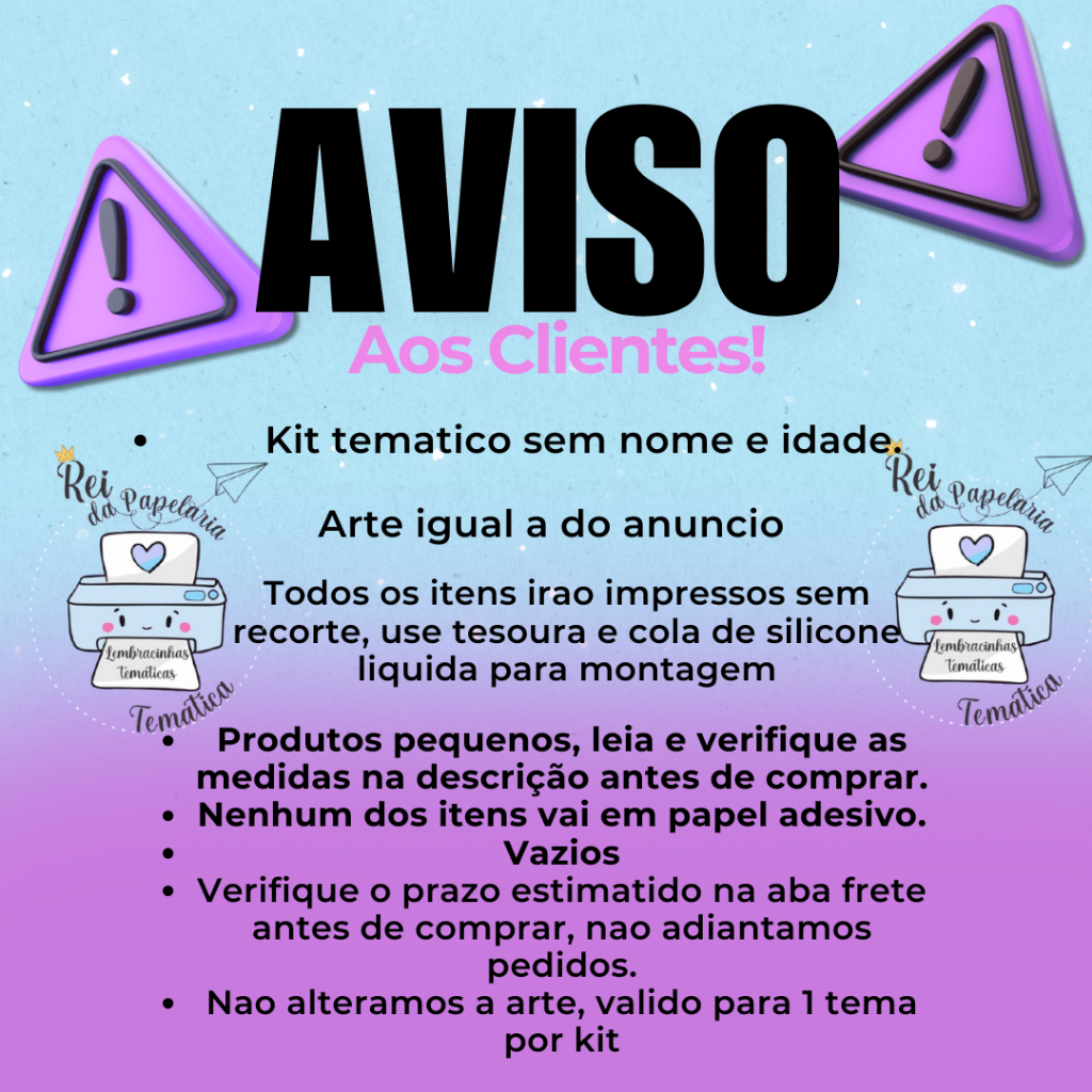 ⭐ POR FAVOR, LEIA COM ATENÇÃO! ⭐ Kit para festa de aniversário com lembrancinhas impressas em folha, para que você mesmo recorte, dobre e cole. As caixas são pequenas, ideais para quem busca delicadeza e economia. 📄 MATERIAL ✔ Produzido em papel fotográfico brilho 180g ✔ Material padrão, sem opção de escolha ✔ Tags NÃO adesivas: impressas no mesmo papel das caixinhas e devem ser coladas com a mesma cola utilizada nos demais itens 🚚 PRAZO DE ENTREGA Para verificar a estimativa de entrega, clique na aba FRETE, logo abaixo do título do anúncio. 👉 Atente-se e respeite o prazo de postagem. ❗ Não trabalhamos com urgência e não atendemos pedidos fora do prazo. ⚠️ ANTES DE EFETUAR A COMPRA ✔️ Verifique se o tema desejado está disponível. Temos duas variações: 🔹 SEM nome e idade ➡️ Ao selecionar esta opção, você receberá o kit temático padrão, sem direito à inclusão de nome e idade. 🔹 COM nome e idade ➡️ Ao selecionar esta opção, após a compra, é obrigatório enviar imediatamente o nome e a idade pelo chat da loja. ⏰ Caso os dados não sejam enviados em até 12 horas após a confirmação do pedido, o kit será enviado SEM nome e idade, sem exceções. ✔️ Válido apenas para artes/temas disponíveis no portfólio da loja. ❗ Para temas não disponíveis, será cobrado valor adicional para criação da arte. ❗ IMPORTANTE Itens pequenos, ideais para quem busca economia e delicadeza. 🚫 Se você procura itens grandes, recortados ou montados, NÃO efetue a compra! 📦 KIT COM 85 ITENS (Caixas pequenas | Sem recorte | Sem alterações | Arte padrão da loja) 5 caixas coração (12 x 8 cm) 5 caixas Bis (7 x 2 cm) 5 cones (14 x 6 cm) 5 caixas pirâmide (12 x 5 cm) 5 caixas almofada (8 cm) 10 tags redondas 5 cm (sugestão: latinhas) 10 tags quadradas 4 cm (sugestão: caixa acrílica) 10 tags personagem 5 cm (sugestão: tubetes) 30 tags redondas 3 cm (sugestão: docinhos) 📦 KIT COM 170 ITENS (Caixas pequenas | Sem recorte | Sem alterações | Arte padrão da loja) 10 caixas coração (12 x 8 cm) 10 caixas Bis (7 x 2 cm) 10 cones (14 x 6 cm) 10 caixas pirâmide (12 x 5 cm) 10 caixas almofada (8 cm) 20 tags redondas 5 cm (sugestão: latinhas) 20 tags quadradas 4 cm (sugestão: caixa acrílica) 20 tags personagem 5 cm (sugestão: tubetes) 60 tags redondas 3 cm (sugestão: docinhos) 📝 OBSERVAÇÕES FINAIS ✔️ Nesta promoção, vendemos as folhas impressas no tema da festa. O cliente realiza o recorte, dobra e colagem. ✔️ Após a conclusão do pedido, solicite o vídeo tutorial pelo chat, caso precise. 🎨 As cores podem variar levemente conforme o monitor ou tela utilizada. 🚫 Itens personalizados não podem ser devolvidos. Agradecemos a compreensão.