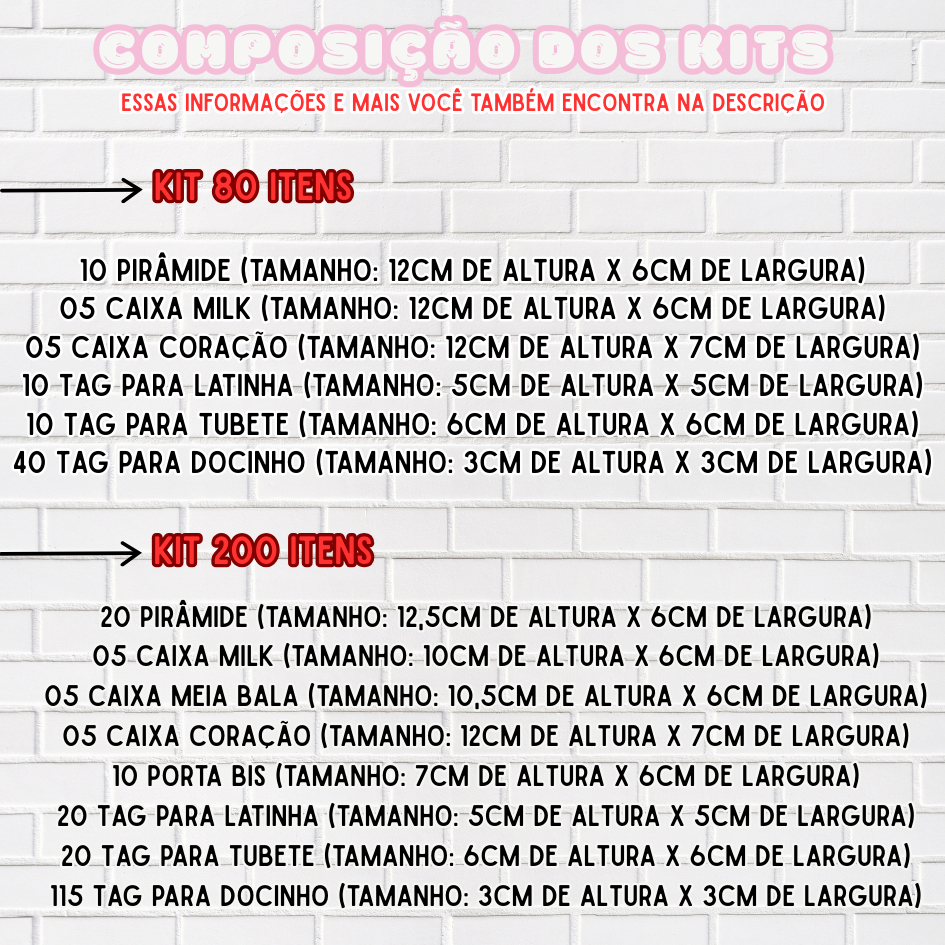⚠️IMPORTANTE⚠️ 🚨 POR FAVOR ENVIAR O NOME E A IDADE LOGO APÓS A COMPRA DE FORMA (IMEDIATADA). CASO NÃO FOR ENVIADO, O PRODUTO SERÁ ENVIADO SEM A PERSONALIZAÇÃO 🚚ENVIO RÁPIDO. FAÇA UMA SIMULAÇÃO DE COMPRA NO SEU APP PARA CHECAR O PRAZO DE ENVIO + ENTREGA!!!!! (O produto chegará dentro desse prazo DE PREVISÃO) ⚫PARA PRODUTOS PERSONALIZADOS: ATÉ 3 DIAS ÚTEIS ⚫PARA PRODUTOS SEM PERSONALIZAÇÃO: ENVIO IMEDIATO ✂️KIT PEGUE E MONTE. O material é enviado em folha PARA QUE O CLIENTE CORTE, DOBRE E COLE. (Se for de sua opção, enviamos todo um suporte em vídeo para tornar sua montagem rápida e prática. ESSE SUPORTE DEVE SER SOLICITADO NO CHAT). ⚖️ Código de Defesa do Consumidor – Art. 49: Produtos personalizados não se enquadram no direito de arrependimento, pois são feitos exclusivamente sob demanda. NÃO ACEITAREMOS DEVOLUÇÃO DE PRODUTOS PERSONALIZADOS POR MOTIVO DE DESISTÊNCIA DO EVENTO OU ARREPENDIMENTO! ------------------------------------------------------------------------------------------------------------------------------------------------------------------------------------------------------------------------------------------------ ⬇O KIT DE 200 ITENS É COMPOSTO POR⬇ 20 Pirâmide (TAMANHO: 12,5CM DE ALTURA X 6CM DE LARGURA) 05 Caixa Milk (TAMANHO: 10CM DE ALTURA X 5CM DE LARGURA) 05 Caixa Meia Bala (TAMANHO: 10,5CM DE ALTURA X 6CM DE LARGURA) 05 Caixa Coração (TAMANHO: 12CM DE ALTURA X 7CM DE LARGURA) 10 Porta Bis (TAMANHO: 7CM DE ALTURA X 6CM DE LARGURA) 20 Tag para Latinha (TAMANHO: 5CM DE ALTURA X 5CM DE LARGURA) 20 Tag para Tubete (TAMANHO: 6CM DE ALTURA X 6CM DE LARGURA) 115 Tag para Docinho (TAMANHO: 3CM DE ALTURA X 3CM DE LARGURA) - OS MODELOS DAS CAIXAS NÃO PODEM SER ALTERADOS; ⬇O KIT DE 80 ITENS É COMPOSTO POR⬇ 10 Pirâmide (TAMANHO: 12CM DE ALTURA X 6CM DE LARGURA) 05 Caixa Milk (TAMANHO: 10CM DE ALTURA X 5CM DE LARGURA) 05 Caixa Coração (TAMANHO: 12CM DE ALTURA X 7CM DE LARGURA) 10 Tag para Latinha (TAMANHO: 5CM DE ALTURA X 5CM DE LARGURA) 10 Tag para Tubete (TAMANHO: 6CM DE ALTURA X 6CM DE LARGURA) 40 Tag para Docinho (TAMANHO: 3CM DE ALTURA X 3CM DE LARGURA) ------------------------------------------------------------------------------------------------------------------------------------------------------------------------------------------------------------------------------------------------ ⚠️OUTRAS OBSERVAÇÕES IMPORTANTES⚠️ ⚫ATENÇÃO AOS TAMANHOS PARA QUE NÃO HAJA PROBLEMAS POSTERIORES. NÃO ACEITAREMOS DEVOLUÇÃO POR ESTE MOTIVO! ⚫NÃO ENVIAMOS LAÇO, APLIQUE, COLA OU GULOSEIMAS!!!!! ⚫TODO O MATERIAL CONFECCIONADO EM PAPEL GLOSSY 180G; ⚫ AS LARGURAS ACIMA PODEM SOFRER PEQUENAS ALTERAÇÕES NO MOMENTO DO CORTE; ⚫ AS CORES ENVIADAS VIA REMOTAMENTE PODEM SOFRER MODIFICAÇÕES DE TONALIDADE NA IMPRESSÃO; ⚫NÃO EDITAMOS AS UNIDADES, MODELOS E ITENS DO KIT; ⚫NÃO EDITAMOS A ARTE, SOMENTE NOME E IDADE. Qualquer dúvida nos acione! Agradecemos a sua compra!