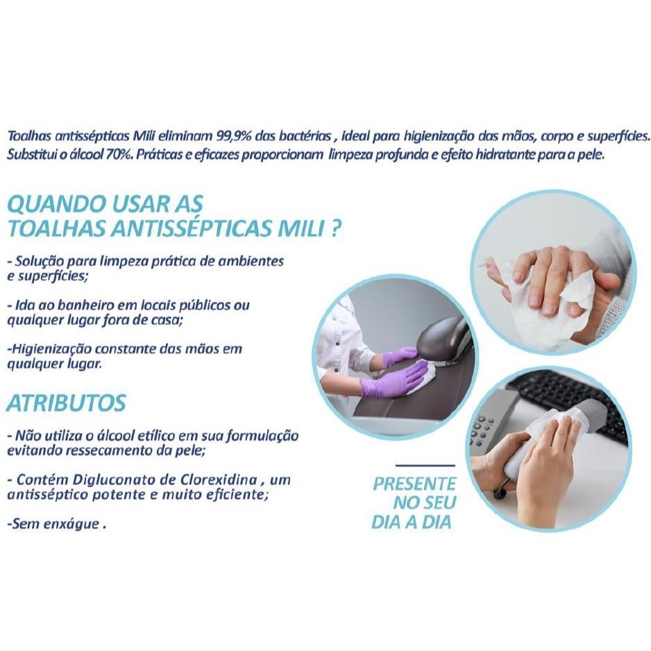 Kit com 12 pacotes de toalhas Antissépticas Mili - Total 600 unidades Os Lenços Umedecidos Mili Umedecidas são ideais para proporcionar limpeza e proteção a qualquer momento do dia. Perfeitos para uso diário, eles garantem uma higienização prática e eficaz, mantendo sua pele sempre fresca e protegida. Características: - Ação Antisséptica: Elimina 99,9% das bactérias, proporcionando uma higienização eficaz e segura. - Uso Versátil: Ideal para mãos, rosto e superfícies, oferecendo uma limpeza completa onde você estiver. - Fórmula Suave: Enriquecida com agentes hidratantes, que cuidam da pele, deixando-a macia e protegida. - Dermatologicamente Testados: Seguros para todos os tipos de pele, incluindo as mais sensíveis. - Embalagem Prática: Fácil de levar na bolsa ou mochila, garantindo limpeza e proteção sempre à mão. Benefícios: - Higiene e Praticidade: Perfeitos para uso em qualquer lugar, seja em casa, no trabalho ou em viagens. - Proteção e Cuidado: Fórmula antisséptica que mantém a pele protegida contra germes e bactérias. - Toque Suave: Deixa a pele limpa, hidratada e com uma sensação agradável de frescor.