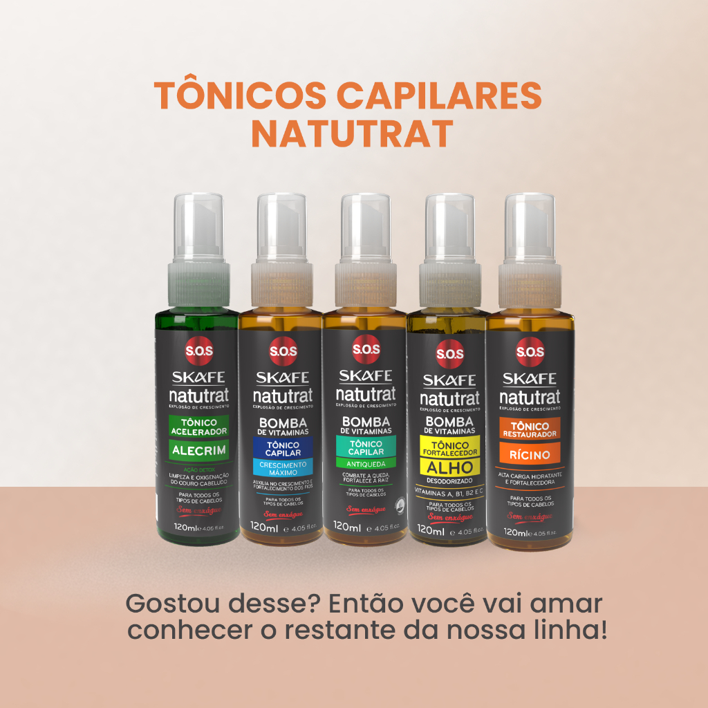 💥 Tônico Capilar Natutrat Skafe – Crescimento Máximo 120ml Quer crescimento acelerado, cabelos mais fortes e livres da queda? O Tônico Capilar Natutrat Bomba de Vitaminas é a solução ideal para você. Com fórmula enriquecida com Biotina e D-Pantenol, ele ativa a raiz, fortalece os fios e proporciona crescimento visível em pouco tempo. 🌱 100% Vegano e Natural Livre de parabenos, sulfatos e petrolatos. Seguro para uso diário em todos os tipos de cabelo. 🔬 Benefícios: Estimula o crescimento rápido e saudável Combate à queda e quebra dos fios Nutrição intensa com Biotina e D-Pantenol Fortalecimento capilar desde a raiz Aumenta a densidade e resistência dos cabelos 🧴 Modo de Uso: Aplique diretamente no couro cabeludo e massageie com as pontas dos dedos. Pode ser usado diariamente, com cabelos secos ou úmidos. Não é necessário enxaguar.
