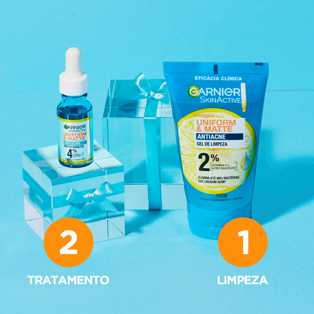 Esse Kit contem a rotina completa AntiAcne Garnier. O novo UNIFORM & MATTE ANTIACNE 3EM1 LIMPEZA FACIAL DIÁRIA é uma nova geração de limpeza esfoliante leve com resultados clinicamente comprovados antioleosidade, antiacne e antimarcas. Fórmula enriquecida com poderosos ativos dermatológicos. ÁCIDO SALICÍLICO: Conhecido por sua propriedade antibacteriana e por ajudar a combater cravos e espinhas. VITAMINA C: Conhecida por suas propriedades antioxidantes, ajuda a reduzir marcas relacionadas a imperfeições. EFICÁCIA COMPROVADA Após 1 uso: -97% excesso sebo, Elimina até 99% bacterias que causam acne Após 4 semanas de uso: -46% oleosidade, -33% acne, -38% intensidade das marcas de acne O novo UNIFORM & MATTE ANTIACNE GEL DE LIMPEZA é uma nova geração de limpeza purificante em gel que controla a oleosidade e elemina até 99% das batérias que causam acne*, reduzindo cravos e espinhas. Eficácia clínica comprovada. Com Ácido salicílico: Conhecido por sua propriedade antibacteriana e por ajudar a combater cravos e espinhas. Com Vitamina C: Conhecida por suas propriedades antioxidantes, ajuda a reduzir marcas relacionadas a imperfeições. Toda a Linha Garnier AntiAcne possui fórmula vegana e aprovado pela Cruelty Free International pelo Programa Leaping Bunny.