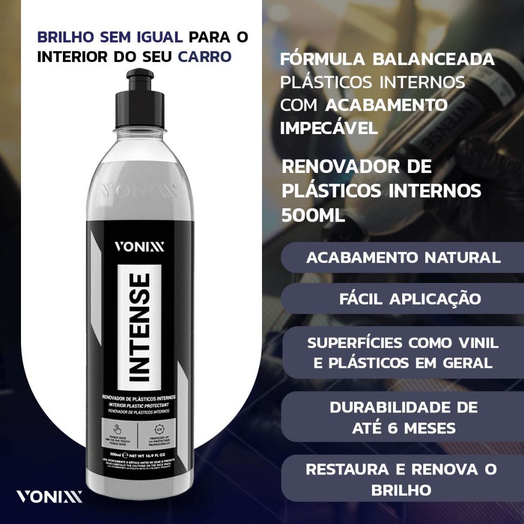 KIT CONTÉM: 01 – V-FLOC 500ML 01 – SINTRA FAST 500ML 01 – TOK FINAL 500ML 01 – INTENSE 500ML 01 – PNEU PRETINHO 500ML 01 – Pincel Interno 01 – Aplicador de Espuma Vonixx 01 – Aplicador de Pretinho 01 – Pano de Microfibra 40x40cm SORTIDO 01 – Luva de Microfibra V-FLOC – LAVA AUTOS SUPER CONCENTRADO V-FLOC é um lava autos de alta performance, com pH neutro. Sua fórmula contém agentes condicionadores e tensoativos especiais que proporcionam uma lavagem suave e altamente eficiente. Possui elevado grau de lubrificação, promovendo significativa redução do coeficiente de atrito, o que garante melhor deslize da luva de microfibra e reduz de forma efetiva as chances de microrriscos na pintura. Além disso, V-FLOC promove brilho e aspecto de renovação da pintura. DILUIÇÃO: 1:20 – Uso em Snow Foam 1:400 – Lavagem comum com balde RENDIMENTO: 500 ml: até 200 litros de solução. SINTRA FAST – LIMPADOR MULTIUSO BACTERICIDA Sintra Fast é um multi-limpador universal, bactericida e germicida, com pH balanceado. É indicado para a limpeza de painéis, laterais e cantos de portas, bancos de couro, carpetes e estofados. Possui alto poder de remoção de manchas de gordura e sujeiras diversas, além de eliminar microrganismos causadores de doenças no interior do veículo. Sintra Fast também reduz maus odores, deixando o ambiente interno mais saudável e livre de impurezas. CARNAÚBA TOK FINAL – CERA DE MANUTENÇÃO EM SPRAY Tok Final foi desenvolvida com a mais pura cera de carnaúba cearense e polímeros de última geração, que protegem e realçam o brilho da pintura automotiva. É ideal para uso após a lavagem e para manutenção da proteção da pintura entre os enceramentos. Pode ser aplicada em todas as partes do veículo, incluindo vidros, para-choques e borrachas. DURABILIDADE: Até 30 dias de proteção. INTENSE – RENOVADOR DE PLÁSTICOS INTERNOS Intense é um renovador de plásticos com proteção UV. Sua fórmula balanceada proporciona acabamento natural, toque seco e excelente durabilidade. O produto é indicado exclusivamente para uso interno, podendo ser aplicado em superfícies como vinil e plásticos em geral. DURABILIDADE: Até 6 meses de proteção nos plásticos internos. PNEU PRETINHO 500ML Efeito brilho molhado. Super concentrado O Pneu Pretinho foi especialmente desenvolvido para proteger, conservar e proporcionar brilho aos pneus em geral. Oferece proteção prolongada e brilho intenso e duradouro, deixando os pneus com aspecto de novos.