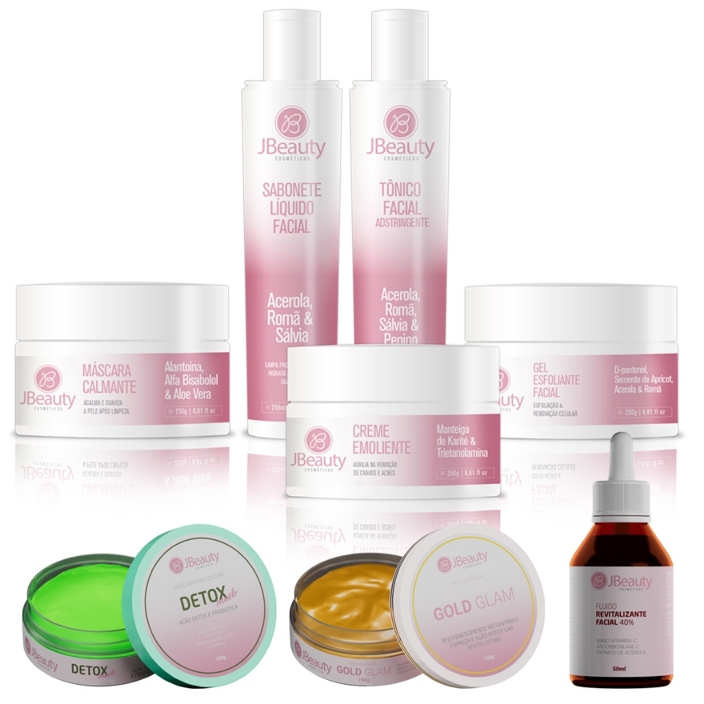 Kit Limpeza de Pele Completo JBeauty 8 Itens | Vitamina C 40% + Detox + Gold Glam + Limpeza Completa