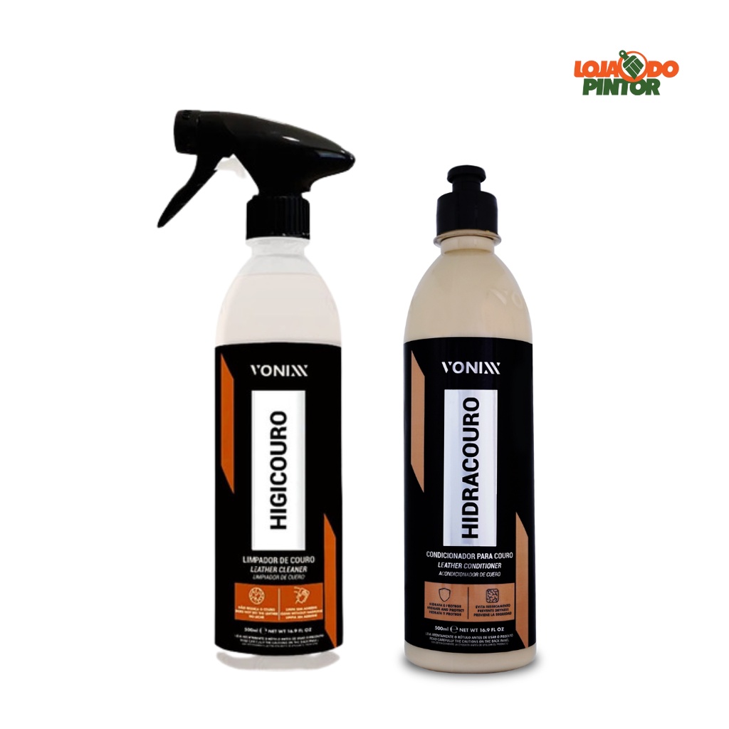 KIT COM 1 Hidracouro 500ml Vonixx 1 Higicouro 500ml Vonixx HIGICOURO limpa com segurança bancos e outras superfícies de couro de veículos e remove impurezas com extrema facilidade, sem agredir o material e renovando o seu aspecto. DILUIÇÃO Pronto uso. INFORMAÇÕES ADICIONAIS Higicouro pode ser utilizado na limpeza de qualquer tipo de couro, natural ou sintético, em veículos, motos, aeronaves e embarcações. Não recomendamos o uso do produto em plásticos. LIMPA SEM AGREDIR ELIMINA ÁCAROS E MOFO PROTEGE E RENOVA DISPONÍVEL EM: 500ML MODO DE USO: Pulverize uma pequena quantidade do produto na superfície a ser aplicada; Deixe o produto agir por 30 segundos; Faça a limpeza utilizando um aplicador de espuma ou escova macia até o total desprendimento da sujeira; Remova o excesso de sujeira usando uma toalha de microfibra levemente umedecida até a completa limpeza; Se necessário, repita a operação. ----------------------------------------------------------------- HIDRACOURO - HIDRATANTE PARA COURO O Hidracouro Vonixx é um produto que hidrata e protege bancos de couro. Sua fórmula à base de lanolina evita o ressecamento do couro, mantendo-o com aspecto de novo. DILUIÇÃO Pronto uso. MODO DE USAR: Limpar a superfície com Higicouro ou Sintra; Aplicar o produto com um aplicador de espuma até a completa hidratação; Se necessário, repetir a operação. Obs.: Caso prefira o couro com aspecto fosco, recomenda-se realizar acabamento com toalha de microfibra limpa e seca. INFORMAÇÕES ADICIONAIS Antes de aplicar Hidracouro, recomendamos a limpeza prévia com Higicouro ou Sintra. RENOVA E PROMOVE BRILHO AGE CONTRA O RESSECAMENTO DEVOLVE A MACIEZ DO COURO