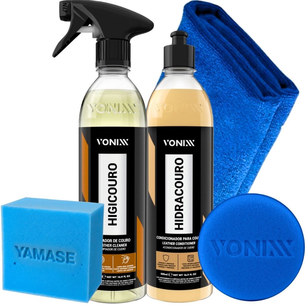 KIT CONTÉM: HIGICOURO 500ML HIDRACOURO 500ML PANO DE MICROFIBRA 40X40CM APLICADOR DE ESPUMA ----------------------------------------------------------------- HIGICOURO 500ML - LIMPADOR DE BANCOS DE COURO DESCRIÇÃO: Higicouro limpa com segurança bancos e outras superfícies de couro de veículos e remove impurezas com extrema facilidade, sem agredir o material e renovando o seu aspecto. - Higicouro pode ser utilizado na limpeza de qualquer tipo de couro, natural ou sintético, em veículos, motos, aeronaves e embarcações - Não recomendamos o uso do produto em plásticos MODO DE USO: 1. Pulverize uma pequena quantidade do produto na superfície a ser aplicada 2. Deixe o produto agir por 30 segundos 3. Faça a limpeza utilizando um aplicador de espuma ou escova macia até o total desprendimento da sujeira 4. Remova o excesso de sujeira usando uma toalha de microfibra levemente umedecida até a completa limpeza 5. Se necessário, repita a operação --------------------------------------------------------------------------- HIDRACOURO 500ML - HIDRATANTE PARA COURO DESCRIÇÃO: O Hidracouro Vonixx é um produto que hidrata e protege bancos de couro. Sua fórmula à base de lanolina evita o ressecamento do couro, mantendo-o com aspecto de novo MODO DE USO: 1. Limpar a superfície com Higicouro 2. Aplicar o produto com um aplicador de espuma até a completa hidratação 3. Se necessário, repetir a operação