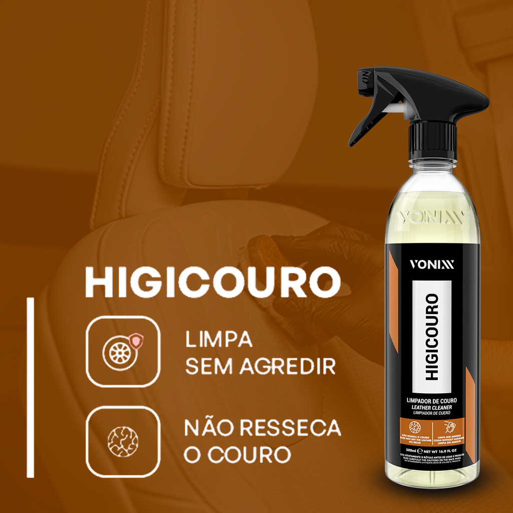 Conteúdo do Kit: 1- Higicouro 500ml Vonixx 1- V-Floc 500ml Vonixx 1- Sintra 500ml Vonixx O kit de produtos da Vonixx composto pelo Higicouro 500ml, Sintra Fast 500ml e V-Floc 500ml é a escolha ideal para quem deseja uma limpeza completa e eficiente de seu veículo, tanto na parte interna quanto externa. Juntos, o Higicouro 500ml, Sintra Fast 500ml e V-Floc 500ml da Vonixx oferecem uma solução completa para a limpeza e conservação do seu veículo, tanto na parte interna quanto externa. Com esses produtos, você poderá ter a certeza de que está mantendo seu carro sempre limpo, conservado e protegido, prolongando sua vida útil e garantindo a satisfação ao dirigir. ---------------------------------------------------------------------------------- HIGICOURO O Higicouro 500ml é um produto de limpeza e hidratação para bancos de couro e sintéticos, que limpa e condiciona o couro, deixando-o com aspecto de novo. Sua fórmula exclusiva é capaz de remover sujeiras e manchas, sem danificar o couro, prolongando sua vida útil. DILUIÇÃO Pronto uso. INFORMAÇÕES ADICIONAIS Higicouro pode ser utilizado na limpeza de qualquer tipo de couro, natural ou sintético, em veículos, motos, aeronaves e embarcações. Não recomendamos o uso do produto em plásticos. - Limpa sem agredir - Elimina ácaros e mofo - Protege e renova MODO DE USO: 1. Pulverize uma pequena quantidade do produto na superfície a ser aplicada; 2. Deixe o produto agir por 30 segundos; 3. Faça a limpeza utilizando um aplicador de espuma ou escova macia até o total desprendimento da sujeira; 4. Remova o excesso de sujeira usando uma toalha de microfibra levemente umedecida até a completa limpeza; 5. Se necessário, repita a operação. ---------------------------------------------------------------------------------- V-FLOC O V-Floc 500ml é um produto para lavagem externa do veículo, formulado com tensoativos especiais que removem a sujeira de forma eficiente e sem danificar a pintura. Sua fórmula concentrada garante economia e rendimento, proporcionando um acabamento brilhante e duradouro. DILUIÇÃO 1:20 – Uso na Snow Foam 1:400 – Lavagem comum com balde INFORMAÇÕES ADICIONAIS Tem alto grau de lubrificação e proporciona lavagem suave. Tem poder de limpeza de um shampoo com poder desengraxante. Rendimento: 500ml: Até 200 litros de solução. 1,5L: Até 600 litros de solução. 3L: Até 1200 litros de solução. 5L: Até 2000 litros de solução. - pH neutro - Alto rendimento - Limpa e condiciona MODO DE USAR: 1. Realizar a pré-lavagem do veículo para retirada do excesso de sujeira; 2. Diluir aproximadamente 10ml de V-FLOC em 4 litros de água; Recomendamos ajustar a quantidade de produto de acordo com o nível de sujeira; 3. Iniciar a lavagem com o auxílio de Luva de Microfibra, sempre começando pela parte superior do veículo; 4. Mergulhar a luva na solução e esfregar suavemente, até completar todo o veículo; 5. Enxaguar em seguida até a retirada de todo o produto; 6. Recomendamos o uso da Toalha de Secagem para finalizar. ---------------------------------------------------------------------------------- SINTRA FAST O Sintra Fast 500ml é um limpador descontaminante que remove facilmente sujeiras pesadas como graxas, óleos e insetos. Sua fórmula concentrada garante máxima eficiência na limpeza sem danificar a pintura do veículo. Sintra Fast é um multilimpador flotador universal, bactericida e germicida de pH balanceado, indicado para limpeza de painéis, laterais e cantos de portas, bancadas de couro, carpetes e estofados. Promove alto poder de remoção de manchas de gordura e sujeiras diversas, além de eliminar microrganismos causadores de doenças no interior do veículo. Sintra Fast diminui maus odores no interior do veículo, tornando-o mais saudável e livre de impurezas. limpeza de painéis, laterais e cantos de portas, carpetes e estofados. MODO DE USO Em painéis, laterais, cantos de portas e bancos de couro: 1. Pulverizar o produto na superfície a ser limpa e desinfetada. 2. Utilizar pincel, escova macia ou aplicador de espuma e realizar movimentos circulares até observar o desprendimento total da sujeira. 3. Remover o excesso com auxílio de toalha de microfibra úmida. Secar em seguida com uma toalha de microfibra seca.