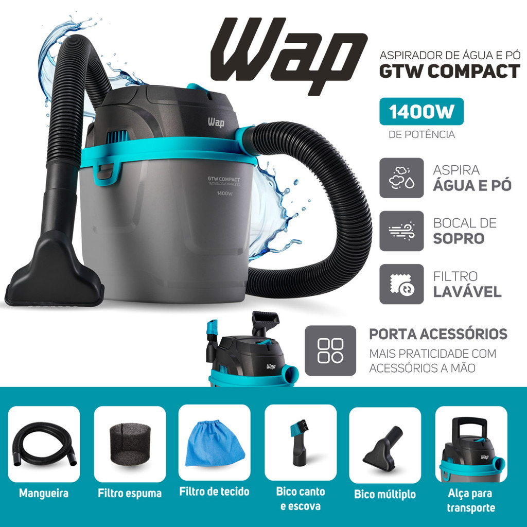 Você estará comprando: 01 Lavadora de Alta Pressão Ágil 1800 Wap Acessórios da Lavadora: - 1 Pistola de Alta Pressão com Trava de Segurança - 1 Lança com bico regulável / Leque e Concentrado - 1 Mangueira de alta pressão de 3 Metros - 1 Engate Rápido - 1 Agulha para limpeza de bico 01 Aspirador de Pó e Água Compact WAP Acessórios do Aspirador: - 1 Filtro de Pano - 1 Filtro Espuma - 1 Bico Múltiplo - 1 Bico Canto/Escova Informações da Lavadora: Movimentação e flexibilidade em um só produto! A lavadora de alta pressão WAP Ágil 1800 é a melhor opção para a limpeza no dia a dia. É ideal para lavar calçadas, bicicletas, motos, carros e paredes com rapidez e agilidade, além de economizar até 80% de água se comparada à mangueira tradicional. Compacta, eficiente e portátil, a WAP Ágil 1800 tem bomba axial com cabeçote de nylon e pistões em aço inox. Além disso, essa lavadora de alta pressão vem equipada com uma alça que facilita o transporte, mangueira de 3 metros, trava de segurança da pistola e o sistema stop total, que corta o fluxo de água e a energia do motor ao soltar o gatilho, o que poupa energia e aumenta a vida útil do motor. Esse sistema também traz maior segurança para trabalhar com sua WAP em qualquer ambiente. Para deixar o trabalho ainda mais dinâmico, ela vem equipada com o engate rápido, para você montar e desmontar a mangueira em um clique, sem a necessidade de usar ferramentas. Bomba axial com cabeçote de nylon e pistões em aço inox. Informações Técnicas da Lavadora: Marca: Wap Tensão: 127v ou 220v ( Escolher conforme disponibilidade) Frequência: 50/60 Hz Potência Elétrica: 1400 Watts Pressão Nominal: 870 Psi (6 Mpa) Pressão Máxima: 1300 Psi (6 Mpa) Pressão Máxima de Entrada de Água: 4 Bar (0,4 Mpa) Temperatura Máxima de Entrada da Água: 40 Litros Vazão Aproximada: 300 L/h ( 5 L/Minuto) Vazão Mínima de alimentação de água: 8 L/minuto Motor: Universal Comprimento do Cabo Elétrico: 5 Metros Comprimento da Mangueira: 3 Metros Nível de ruído sonoro: >80 dB(A) Aceleração no braço do operador: <1 m/s² Classe de Isolação: II Certificado Inmetro: Sim Cor: Amarelo com Preto Dimensões Aproximadas CxLxA: 20x17x45cm Medidas da Embalagem: CxLxA 23x23x49cm Peso Aproximado: 6 Kg Garantia: 1 Ano Informações do Aspirador de Pó e Água WAP GTW Compact Com uma potência de 1400W, o Aspirador de Água e Pó GTW Compact aspira diferentes tipos de sujeiras, sejam líquidas, úmidas ou secas. Limpe pisos, tapetes, carpetes, estofados, colchões e até mesmo o interior do seu carro de forma rápida e eficaz. Além disso, conta com a função de sopro, que permite encher infláveis e soprar folhas do quintal. Com design compacto e leve, o Aspirador Portátil GTW Compact é fácil de transportar e armazenar. Sua alça ergonômica de transporte proporciona conforto durante o uso, enquanto a mangueira de 1,5m e o cabo elétrico de 1,5m garantem um maior alcance durante a limpeza. O Aspirador de Pó e Água Portátil GTW Compact vem equipado com dois filtros essenciais: o filtro de espuma próprio para sucção de água que protege o motor e garante o aumento da vida útil do produto, e o filtro de tecido próprio para sucção de outras sujidades. Essa combinação de filtros permite uma limpeza eficaz e completa. Além disso, possui um bico canto e escova, que facilita a limpeza das sujeiras em locais de difícil acesso. E para garantir uma aspiração completa e eficiente, conta também com um bico múltiplo. Com o Aspirador de Pó e Água WAP GTW Compact, você terá um aliado poderoso na limpeza da sua casa. Sua potência, capacidade de armazenamento, acessórios práticos e filtro lavável tornam a limpeza mais eficiente e satisfatória. Não perca mais tempo, adquira agora mesmo o Aspirador de Pó e Água WAP GTW Compact. Compacto, mas sem perder a eficiência, ele é a escolha perfeita para tornar a limpeza mais prática e eficaz. O Aspirador de Pó e Água WAP GTW COMPACT aspira diversos tipos de sujeiras, sejam elas secas, úmidas e líquidas. Ideal para limpezas internas e externas. Aspirador Portátil e Compacto com 1400W. Pequeno, mas sem perder a potência e a eficiência de sucção. Fácil de usar, transportar e guardar. Possui Bocal de Sopro que o transforma em um Soprador, perfeito para soprar folhas e encher infláveis. Informações Técnicas do Aspirador: Tensão: 127v ou 220v (Escolher conforme disponibilidade) Frequência: 60hz Potência Elétrica: 1400W Vácuo: 150mbar Motor: Universal Volume Total do Recipiente: 5,5 Litros Capacidade Útil Líquido: 2,5 Litros Capacidade Útil Sólido: 2,3 Litros Mangueira: 1,3 Metros Cabo Elétrico: 1,5 Metros Tipo de Filtro: Filtro de Pano / Filtro Espuma Níveis de Filtragem: 1 Classe de Isolação: II Aspira Água: Sim Aspira Pó: Sim Função Soprador: Sim Nível de Ruído: 84 dB(A) Cor: Cinza, Preto e Verde. Dimensões Aproximada CxLxA: 22,5x19,5x28,5cm Dimensões Embalagem (CxLxA): 23,5x20,5x30cm Peso Aproximado: 1,6kg Garantia: 1 Ano
