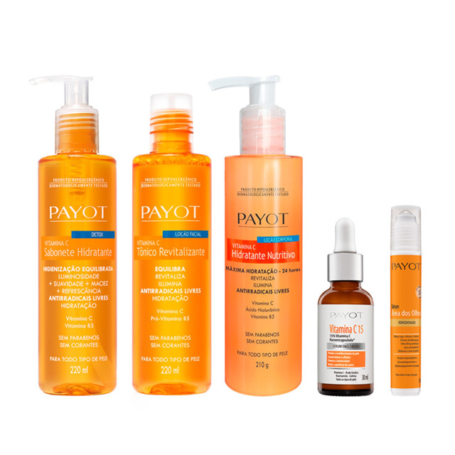 VITAMINA C: Linha antioxidante. Previne o envelhecimento precoce. Devolve o viço e luminosidade à pele. Kit Limpeza Tonificação Hidratação + Séruns C15 e Olhos Vitamina C Payot, contém: 1- SABONETE LIQUIDO DETOX VITAMINA C PAYOT 220ML Ação ou Beneficio: Proporciona higienização equilibrada, desintoxicante, trazendo luminosidade, suavidade, maciez e refrescância. 1- TÔNICO REVITALIZANTE VITAMINA C PAYOT 220ML Ação ou Beneficio: ideal para equilibrar o pH, promover higienização profunda e controlar a oleosidade. 1- HIDRATANTE CORPORAL NUTRITIVO VITAMINA C PAYOT 210g Ação ou beneficio: promove máxima e prolongada hidratação e recuperação. 1- SERUM VITAMINA C PARA OS OLHOS PAYOT 14ML Ação ou Beneficio: área dos olhos protegida, revitalizada e hidratada por todo o dia. 1- SÉRUM VITAMINA C15 PAYOT Ação ou Beneficio: Possui ação antioxidante - hidratante - rejuvenescedora da pele. Suaviza olheiras e inchaços na região dos olhos. Reduz a oleosidade e uniformiza a tonalidade da pele deixando-a com aparência mais firme e iluminada. Rápida absorção. *Nanocápsulas contendo blend de Vitamina C, ácido ferúlico, resveratrol e floretin. Sem parabenos. Produto Vegano. Não possui ingredientes de origem animal e não é testado em animais. Produto Hipoalergênico Dermatologicamente e Oftalmologicamente testado