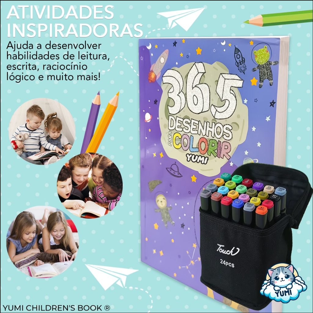 Kit Livro 365 Desenhos Para Colorir + Estojo Bolsa Caneta Canetinhas Touch Com Ponta Dupla
