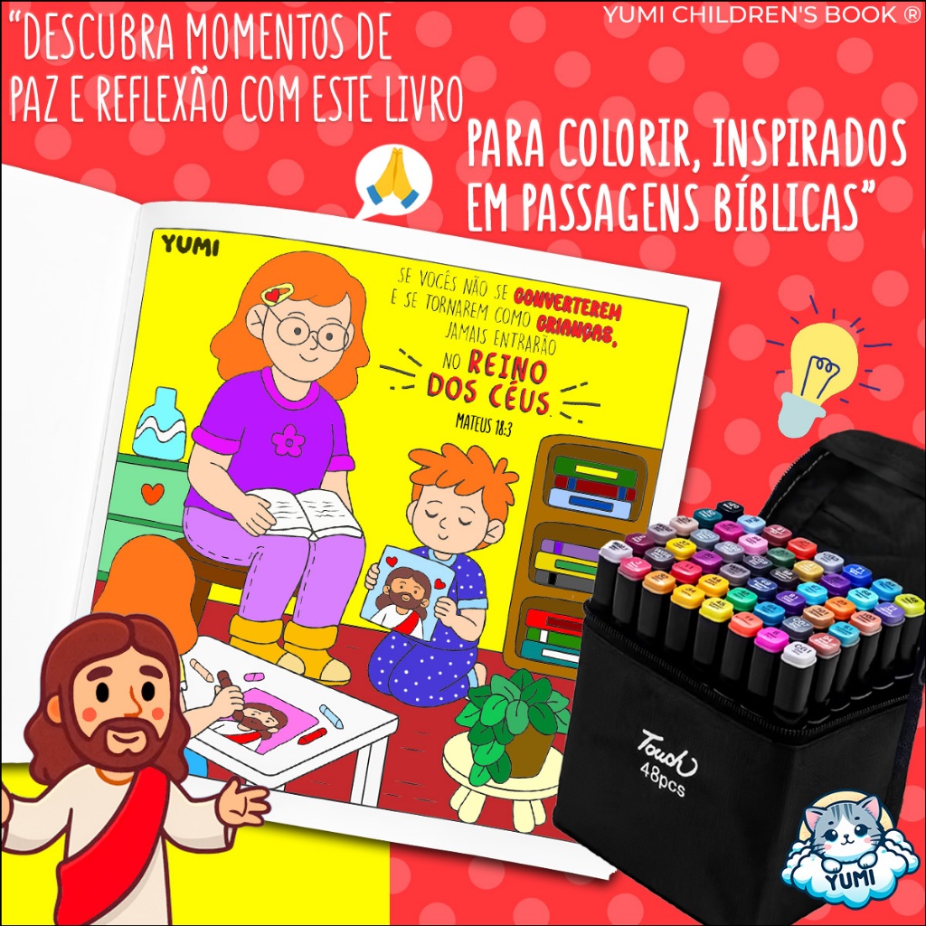 Kit Livro De Colorir Historias Bíblicas Colorindo Com Jesus + 48 Canetinhas Bobbie Touch Ponta Dupla