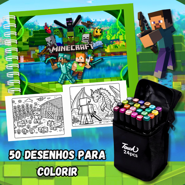 Kit Livro De Colorir Minecraft 50 Folhas 180g Com 24/36/48 Canetinhas Profissionais