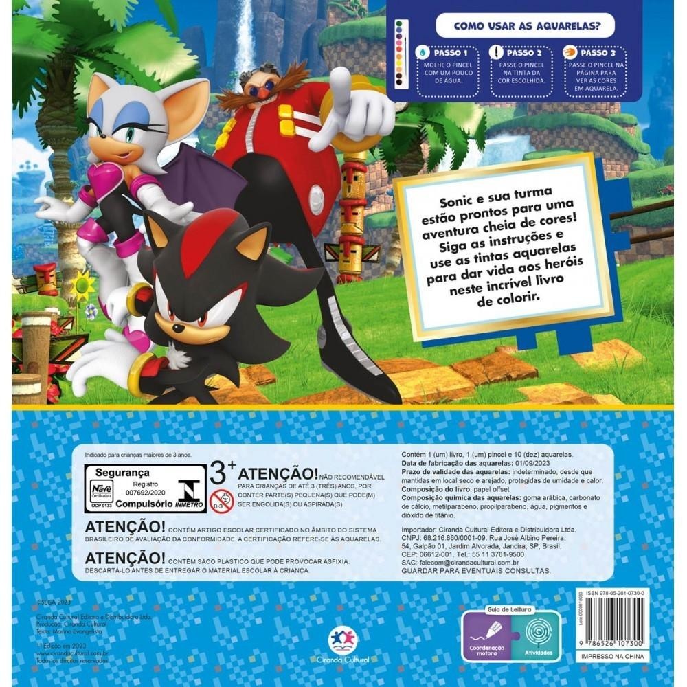 Sonic Aquarela- Cores e aventura Escolha as suas cores favoritas e divirta-se enquanto colore este incrível livro com aquarela. Sonic - Meu livrão de colorir Divirta-se com este livro-tapete fantástico! Ao desdobrar as páginas, você vai encontrar diferentes atividades além de descobrir um grande cenário com todos os personagens do game de Sonic. Convide sua família e torne esse momento memorável! Sonic - Colorindo a turma Sonic e sua turma usam seus talentos para chegar ao fim do dia com mais uma aventura super veloz concluída. Divirta-se colorindo personagens desse game incrível!