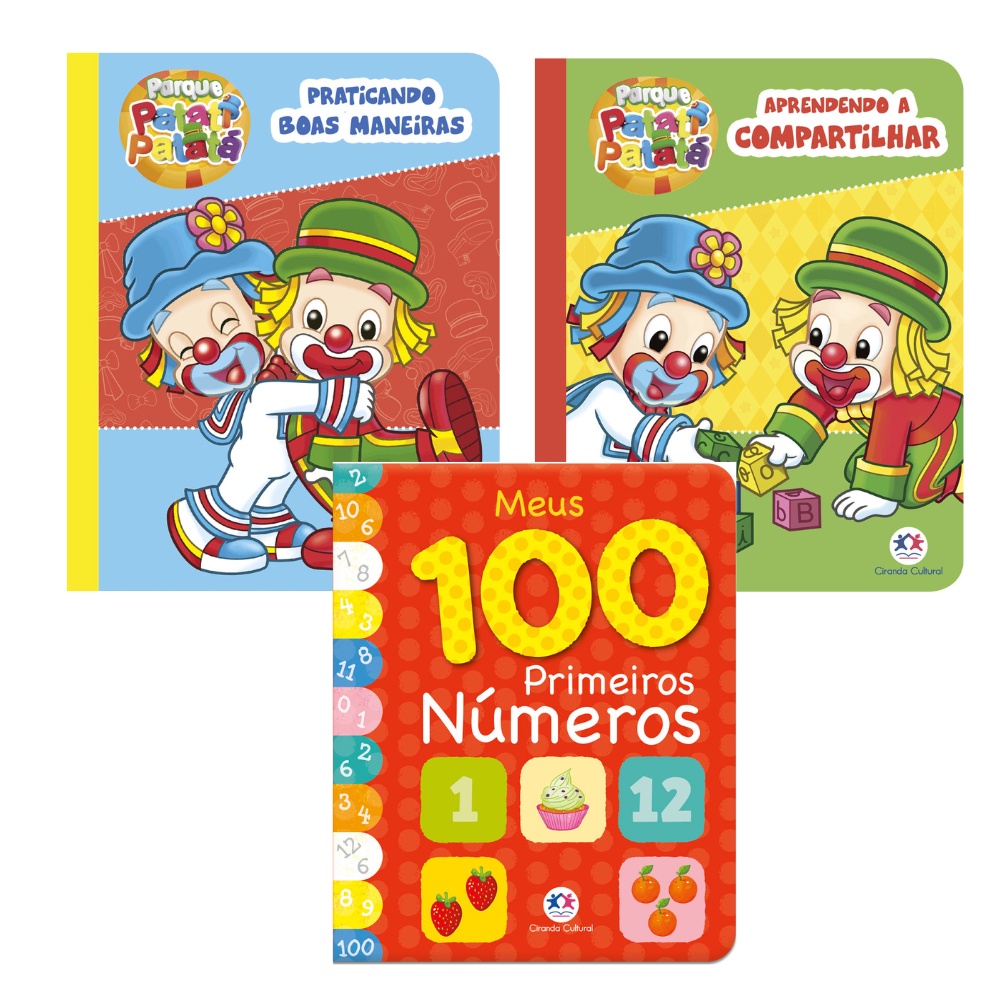 Loja Oficial Ciranda Cultural Kit com 3 Livros, 2 Livros Patati-Patatá e 1 Livro 100 Primeiros Números Capa Almofadada, páginas cartonadas e ilustradas. -Livro - Meus 100 primeiros números Conheça os números de 1 a 100 de uma forma alegre e muito fácil. Você vai aprender a contar com animais fofos, doces saborosos e objetos fantásticos! Editora: Ciranda Cultural Edição: 1, 2014 Autor: Ciranda Cultural Idioma: Português Páginas: 24 Dimensões: L 12.60 x A 15.50 x E 2.70 ISBN: 9788538060864 -Livro - Patati Patatá - Praticando boas maneiras A alegria e as boas maneiras estão sempre presentes no dia a dia da turma do parque. Aprenda com eles sobre lindas atitudes e torne a convivência com sua família e seus amigos ainda mais especial! Editora: Ciranda Cultural Edição: 1, 2019 Autor: Ciranda Cultural Idioma: Português Páginas: 10 Dimensões: L 12.50 x A 15.50 x E 1.60 ISBN: 9788538087328 -Livro - Patati Patatá - Aprendendo a compartilhar A turma do parque está sempre unida, pois sabe que os momentos são mais especiais quando compartilhados. Por isso, eles dividem os brinquedos, as refeições... Com esses queridos amigos, aprenda sobre a importância de dividir. Editora: Ciranda Cultural Edição: 1, 2019 Autor: Ciranda Cultural Idioma: Português Páginas: 10 Dimensões: L 12.50 x A 15.50 x E 1.60 ISBN: 9788538087335