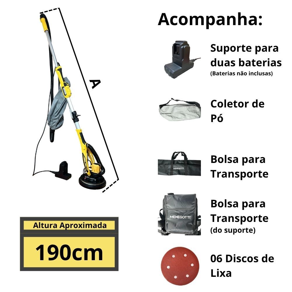 Você está comprando 01 Lixadeira de Parade e Teto 20V Intercambiável 01 Suporte para 2 Baterias (Baterias não inclusas) 01 Bolsa de transporte de costas para o suporte de baterias 01 Bolsa de transporte de mão para lixadeira 01 Coletor de Pó 01 Carregador Rápido 220v Menegotti 02 Baterias Intercambiável 20V 06 Lixas 225m 01 Manual de Instrução 01 Caixa de Papelão Kit Lixadeira de Parede e Teto a Bateria 20V Brushless – MLI Intercambiável Carregador e Bateria 20v A Lixadeira de Parede e Teto a Bateria MLI 20V é a parceira ideal para quem busca acabamentos perfeitos com total liberdade de movimento. Desenvolvida para uso em paredes, tetos e superfícies de gesso, ela também é eficaz na remoção de resíduos, pinturas antigas e pequenas imperfeições em pisos e revestimentos. Seu motor Brushless (sem escovas) garante mais potência, durabilidade e menor manutenção. Com velocidade ajustável de 800 a 1700 rpm, você controla o desempenho conforme o tipo de trabalho. O sistema de sucção com mangueira e regulador integrado ajuda a reduzir a poeira, mantendo o ambiente mais limpo durante o uso. O design ergonômico com alça confortável, cabo extensível e trava de segurança proporciona praticidade e conforto mesmo em longas jornadas. A proteção frontal removível permite alcançar cantos e áreas de difícil acesso, tornando o acabamento mais uniforme. Compatível com baterias 20V intercambiáveis (02 inclusas no kit), essa lixadeira oferece mobilidade total sem depender de tomadas, ideal para obras, reformas e trabalhos profissionais. O Carregador Rápido 220v Menegotti 20V é desenvolvido para quem busca eficiência, segurança e praticidade na recarga das baterias intercambiáveis da linha Menegotti. Com entrada automática 220V, ele adapta-se automaticamente à tensão elétrica, oferecendo proteção contra sobrecarga, curto-circuito e inversão de polaridade, prolongando a vida útil da bateria. Possui capacidade de 4,0Ah, garantindo recarga rápida e constante, mesmo em uso profissional intenso. Seu design compacto e ergonômico permite fácil transporte e ocupa pouco espaço na bancada, sendo ideal tanto para profissionais da construção civil quanto para usuários domésticos ou rurais. A estrutura reforçada foi projetada para suportar as condições mais exigentes de trabalho, enquanto sua tecnologia de recarga inteligente mantém o desempenho e a durabilidade da bateria ao longo do tempo. A Bateria Intercambiável 20V MBI-20 — 4.0Ah foi desenvolvida para oferecer potência, durabilidade e confiabilidade no uso com ferramentas da linha sem fio Menegotti Intercambiável. Projetada com tecnologia de íons de lítio, garante vida útil prolongada, baixa autodescarga e ausência de efeito memória, permitindo recargas a qualquer momento sem perda de desempenho. Ideal para profissionais que buscam autonomia e produtividade, essa bateria possui indicador de carga em LED, permitindo visualizar rapidamente o nível de energia disponível. Seu trilho reforçado garante encaixe firme e seguro, mesmo em trabalhos pesados ou em ambientes de vibração constante Com design compacto e leve, a MBI-20 é a escolha perfeita para quem deseja trabalho contínuo e potência estável ao longo do dia. Informações técnicas: Lixadeira Tensão: 20V Litio (02 Bateria inclusa no kit) Classe de Proteção II Motor: Brushless(Sem escovas) Rotação sem carga 800-1700 rpm Diâmetro da Lixa: 225 mm Proteção Frontal: Sim Alça: Sim Cabo Extensivel: Sim Lixa: 06 Unidades Suporte das Baterias: Sim Regulador de Velocidade: Sim Interruptor do Led: Sim Trava do Cabo: Sim Trava do Cabo Extensivel: Sim Suporte de Velcro para Lixa: Sim Canal de Sucção: Sim Regulador de Sucção: Sim Mangueira de Sucção: Sim Peso Aprox: 4.200g Garantia de 12 meses concedido pelo fabricante Carregador Marca: Menegotti Tensão: 220V Tensão de saída: 20V DC Corrente de carga: 4,0Ah Tipo de bateria compatível: Íons de lítio (Li-ion) — Linha Intercambiável Menegotti Peso: 0,450 kg Dimensões (C×L×A): 12×8×17 cm Garantia de 3 meses de fábrica contra defeitos de fabricação, conforme política Menegotti. Bateria Tensão nominal: 20V DC. Capacidade: 4,0 Ah. Tipo de bateria: Íons de Lítio (Li-ion). Compatibilidade: Linha Intercambiável Menegotti 20V. Indicador de carga: Sim (LED). Cor: Preto. Peso líquido: 0,62 kg. Material: Polímero técnico e componentes eletrônicos de alta densidade. Garantia de 3 meses de garantia de fábrica contra defeitos de fabricação, conforme política Menegotti. Sku da Loja kit2782L