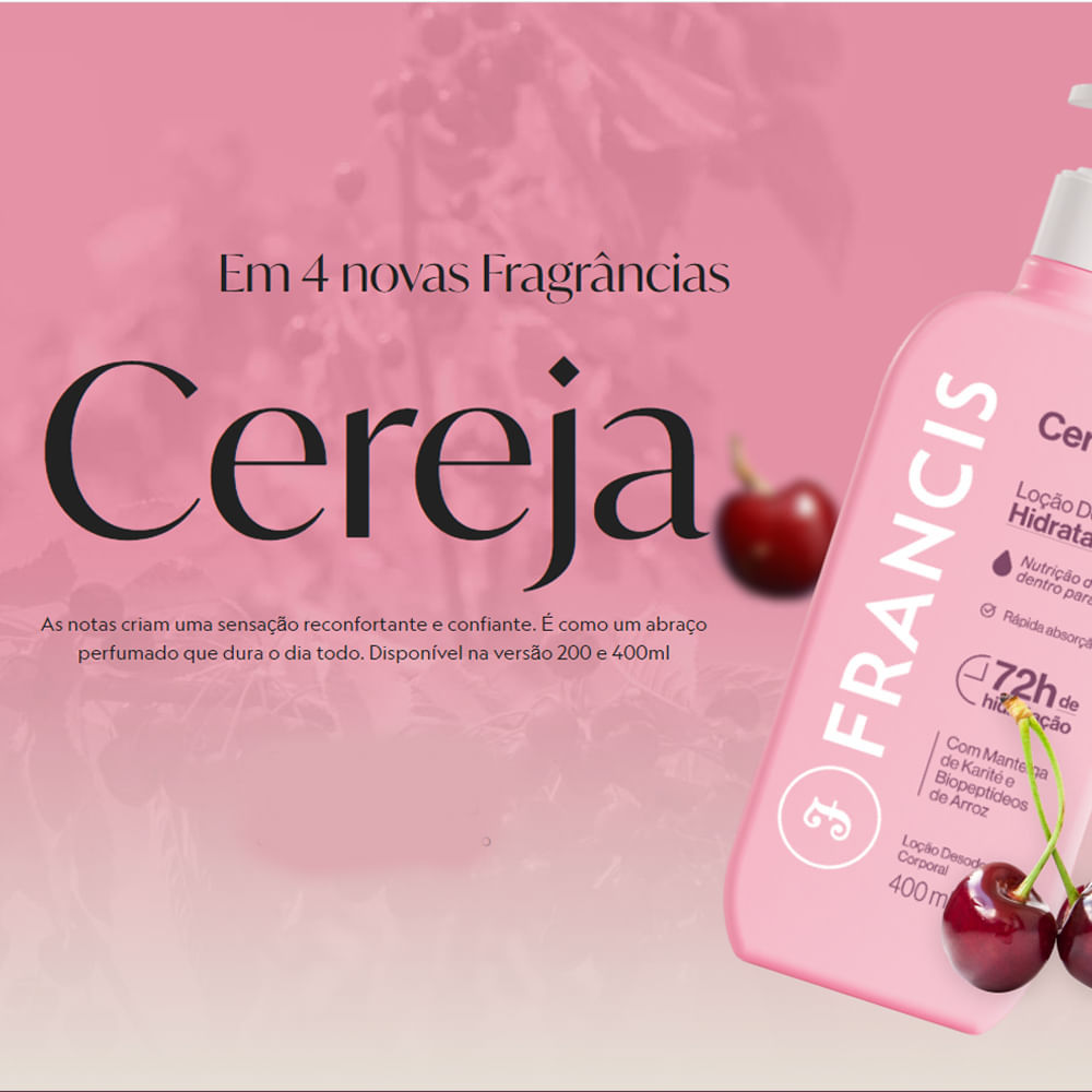 A Loção Hidratante Francis Cereja 400ml oferece 72 horas de hidratação, deixando a pele macia e nutrida por mais tempo. Sua fórmula é enriquecida com Manteiga de Karité e Biopeptídeos de Arroz, que agem profundamente para nutrir a pele de dentro para fora. A loção tem rápida absorção, garantindo uma pele suave, com toque aveludado e um brilho natural. Além de hidratar,ela perfuma a pele com a deliciosa fragrância de cereja, proporcionando uma sensação agradável e revigorante. Ideal para quem busca praticidade e um cuidado eficiente no dia a dia. Benefícios: - Hidratação intensa por 72 horas; - Nutrição profunda com Manteiga de Karité e Biopeptídeos de Arroz; - Rápida absorção, sem sensação oleosa; - Pele macia, aveludada e com brilho natural; - Fragrância deliciosa de cereja. Modo de usar: Aplique a loção diariamente na pele limpa e seca, massageando até que o produto seja completamente absorvido. Contém no kit: - Loção Hidratante Francis Cereja 400ml - 6 Unidades Sobre a marca: Francis é uma marca brasileira de produtos para a pele, que tem como missão elevar a vida dos brasileiros através da perfumação. Como quem sempre busca transmitir sofisticação, naturalidade e jovialidade, Francis, pioneira na fabricação de sabonetes com alto poder de perfumação no país, utiliza seu potencial de construção das melhores fragrâncias para inspirar todos ao seu redor.