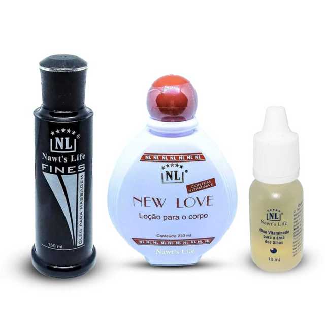 Kit 3 produtos: New Love, Fines e óleo vitaminado Nawts life. O Óleo Para Massagem Fines Nawt’s Life foi especialmente desenvolvido para deixar a pele suave, perfumada e maleável, pronta para ser massageada. Além disso, o óleo para massagem Fines auxilia na prevenção da celulite e gordura localizada. Contém princípios ativos “Castanha da Índia e Salicilato de Metila” que enriquecem a sua formulação. Modo de Usar : Massageie o Finess Óleo para Massagem no sentido contrário ao do tecido da pele. Coloque o Termoelétrico na posição desejada e ligue por 20 minutos. Desligue o aparelho e deixe-o esfriar naturalmente antes de retirá-lo Atencão: Não aplicar nenhum produto ou termoelétrico sobre pele insensível, irritada ou com feridas. NEW LOVE - LOÇÃO HIDRATANTE New Love Loção Para O Corpo Nawt’s Life foi desenvolvida especialmente para hidratar a pele, ajudando a restaurar a umidade natural e impedir o ressecamento provocado pela ação do sol, vento frio e chuva. Modo de Usar : Após o banho, aplicar a New Love Loção Para O Corpo Nawt’s Life generosamente, por todo o corpo, massageando a pele em movimentos circulares, até completa absorção. Composição: Extrato Glicólico de Aveia, Óleo de Amêndoas Doces, Propilenoglicol, Lanolina, Água Deionizada, Metil Parabeno, Propil Parabeno,, etoxilado, Meg, Palmitato de Isopropila, Álcool Cetoestearílico, Poliquaternário 39, Dimeticone, Ciclometicone, Álcool Cítrico, Vitamina E e essência. Uso Externo Conservar o produto á temperatura ambiente e manter a embalagem fechada após o uso. Em caso de contato acidental com os olhos, enxaguar com água. Em caso de irritação, descontinue ou suspenda o uso. Não aplicar em mucosas. Manter fora do alcance de crianças. Conteúdo: 230ml Óleo Vitaminado Rico em vitaminas A e K . Para área dos olhos mas usado para muitos outros fins.