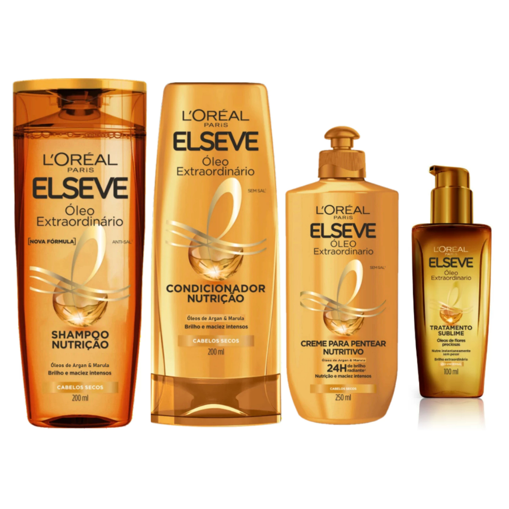Toda linha da L'oreal Elseve Óleo Extraordinário Escolha o KIT que combina mais com você, com sua necessidade ou com seu cabelo. Favor se atentar as variações!!! Shampoo e Condicionador - 200ml Shampoo e Condicionador - 400ml Shampoo e Condicionador - 200ml + Óleo Extraordinário 100ml Shampoo e Condicionador - 200ml + Óleo Extraordinário 100ml + Creme Pentear 250ml Kit Completo Shampoo e Condicionador 200ml + Óleo Extraordinário 100ml + Creme Pentear 250ml + Mascará 300g Kit Completo Shampoo e Condicionador 400ml + Óleo Extraordinário 100ml + Creme Pentear 250ml + Mascará 300g A TECNOLOGIA EXTRAORDINÁRIA A linha Elseve Óleo Extraordinário conta com uma fórmula enriquecida com uma combinação de 6 óleos de flores preciosas que atuam na superfície do fio trazendo maleabilidade, maciez, nutrição e uniformidade para o fio. Elseve Óleo Extraordinário traz para a sua rotina nutrição para seus fios, além de maciez e brilho. PRECISANDO DE UM TRATAMENTO SUBLIME? Criando a combinação perfeita de micro óleos de flores preciosas, garantindo maciez e brilho aos cabelos, o nosso Óleo Extraordinário Tratamento Sublime vem para transformar sua rotina capilar! Sua fórmula rica em 6 óleos de flores raras da natureza é leve e se adapta a todos os tipos de cabelos. Perfeita mistura de ingredientes ativos que transforma todos os tipos de cabelos. SHAMPOO ÓLEO EXTRAORDINÁRIO Limpa suavemente o cabelo que parece estar opaco ou sem vida, retomando seu brilho e toque macio. Cabelos limpos, hidratados e sublimes de todos os ângulos. CONDICIONADOR ÓLEO EXTRAORDINÁRIO Hidrata intensamente, restaurando a luminosidade. O resultado? Cabelo com mais vitalidade, sem pesar, com mais nutrição e sublime em todos os ângulos CREME PARA PENTEAR ÓLEO EXTRAORDINÁRIO O segredo dos óleos de flores preciosas para uma nutrição perfeita & uma leveza infinita estão na linha Elseve Óleo Extraordinário Nutrição. Resultado: os cabelos secos ficam cheios de vida e sem pesar. Sublimes em todos os ângulos. Textura translúcida ultrafina e leve. ÓLEO EXTRAORDINÁRIO O Óleo de Tratamento Elseve Óleo Extraordinário Nutrição tem a combinação perfeita de micro-óleos de flores preciosas, garantindo maciez e brilho aos cabelos. Sua fórmula rica em 6 óleos de flores raras da natureza é leve e se adapta a todos os tipos de cabelos. Perfeita mistura de ingredientes ativos que transforma todos os tipos de cabelos. O óleo promove brilho e nutrição intensa aos fios, controla o frizz, protege o cabelo de temperaturas elevadas, trata de maneira profunda na umectação capilar e turbina máscaras de tratamento através da sua mistura. MASCARA CAPILAR ÓLEO EXTRAORDINÁRIO O Elseve Óleo Extraordinário Nutrição é uma máscara capilar com textura ultrafina e leve, é enriquecida em Micro-Óleos de Flores Preciosas que agem para combater o cabelo seco e sem brilho • Reconstrói a fibra, fazendo com que seu cabelo tenha uma nutrição perfeita, leveza infinita e um brilho excepcional.