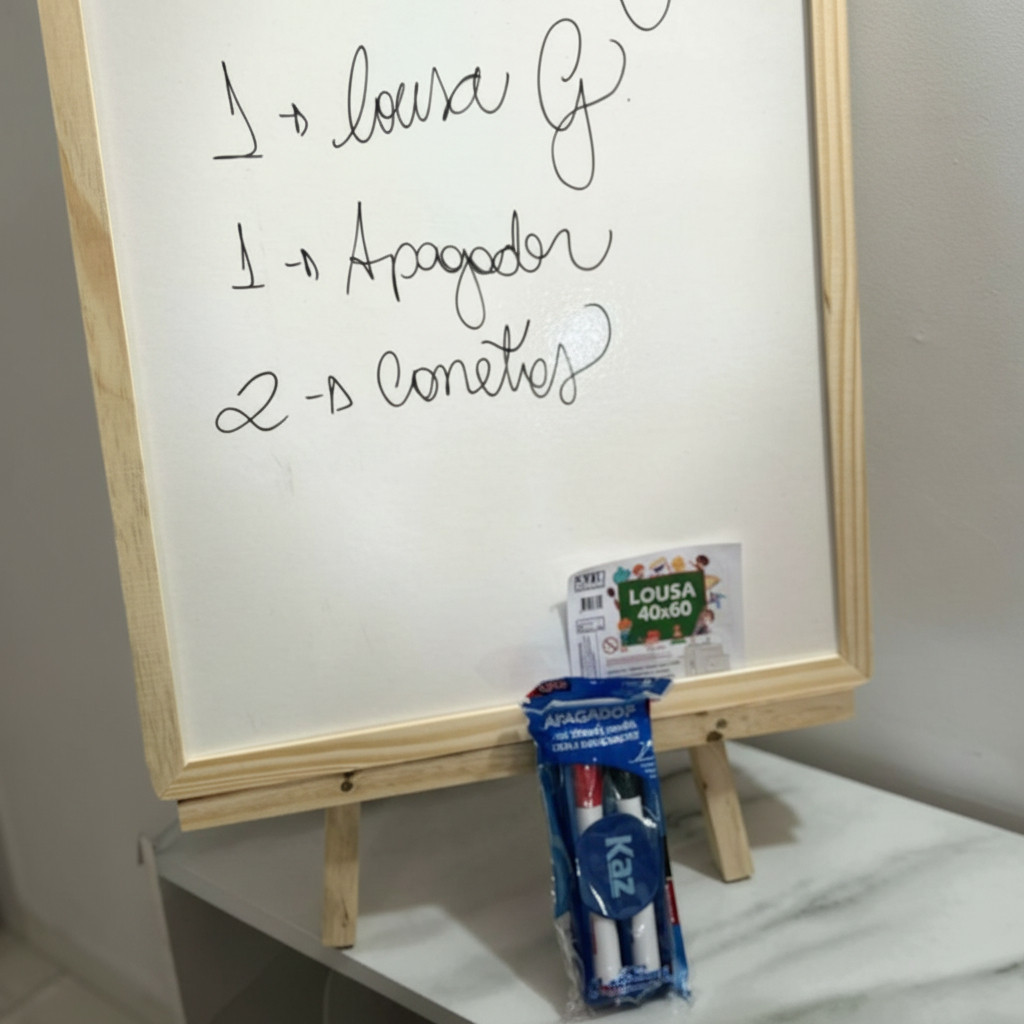Lousa Educativa 40x60 cm com Caneta e Apagador – Unidade A Lousa Educativa 40x60 cm é um recurso prático e versátil para estimular o aprendizado através de atividades de leitura, escrita, desenho e resolução de problemas. Permite uso ilimitado: escrever, apagar e recomeçar quantas vezes necessário, sem desperdício de papel ou materiais. Indicada para alfabetização, exercícios de cálculo, desenho, caligrafia e atividades lúdicas em ambientes escolares, reforço educacional ou uso doméstico. Especificações Técnicas: • Dimensões: 40 x 60 cm • Estrutura: MDF com moldura em madeira de pinus • Acabamento: Resistente, leve e durável • Superfície: Preparada para escrita com caneta específica Conteúdo da Embalagem (Unitário): • 1 Lousa 40 x 60 cm • 1 Caneta marcadora • 1 Apagador Opcional – Cavalete Grande 80x60: Disponível também em versão com cavalete de apoio (80x60 cm), que inclui 2 canetas marcadoras e 1 apagador, permitindo uso em pé e maior estabilidade.