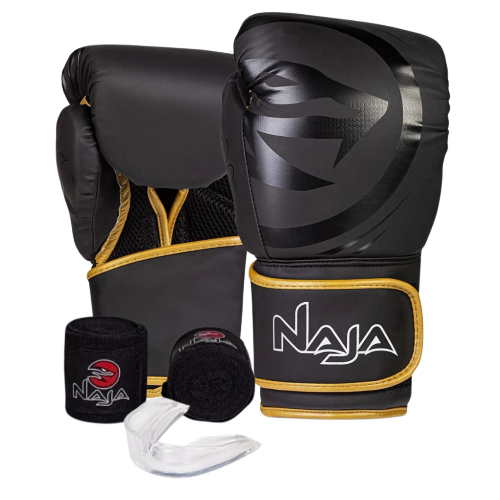 Luva Naja Black Line, Protetor Bucal e Bandagem de 2,5m Além de terem um design inovador, as luvas proporcionam segurança e melhor encaixe para suas mãos durante o treino. São produzidas com a tecnologia HSA que garantem maior absorção dos impactos, evitando lesões. O molde no formato "round" garante um encaixe perfeito ao contorno da mão e punho, proporcionando maior segurança e potencialização nos golpes. A luva é destinada para praticantes e profissionais que buscam a evolução no seu desempenho sem abrir mão do conforto e qualidade. Características: - Tecnologia Mesh, que proporciona maior área de ventilação reduzindo odores; - Tecnologia Hsa (High Shock Absorption), que garante maior absorção nos impactos; - Tecnologia HSA Tech, com três camadas diferentes, que atuam independentemente para um contato suave com a mão; - Acabamento interno, com maior conforto e um melhor encaixe para sua mão; - PU flexível permite liberdade de movimentos durante os treinos; - Gênero: Unissex Composição: - PU (Poliuretano); - Espuma moldada de alta densidade; - Fechamento de alta intensidade ajustável ao pulso. Indicações de uso: - Para pratica de Artes Marciais, Boxe e Muay Thai; - Para uma pratica segura tenha sempre o acompanhamento de um profissional. Tabela de medidas - Masculino 51-63Kg - 10oz 64-74Kg - 12oz 75-90Kg - 14oz Acima de 90Kg - 16oz Tabela de medidas - Feminino 45-50Kg - 10oz 51-60Kg - 12oz 61-70Kg - 12oz Acima de 70Kg - 14oz