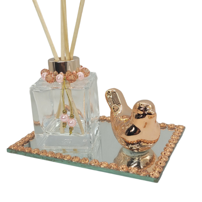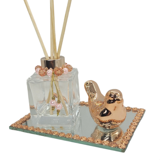 Kit Luxo Frasco Cubo 100ml Rose com Passarinho e Bandeja Decorada