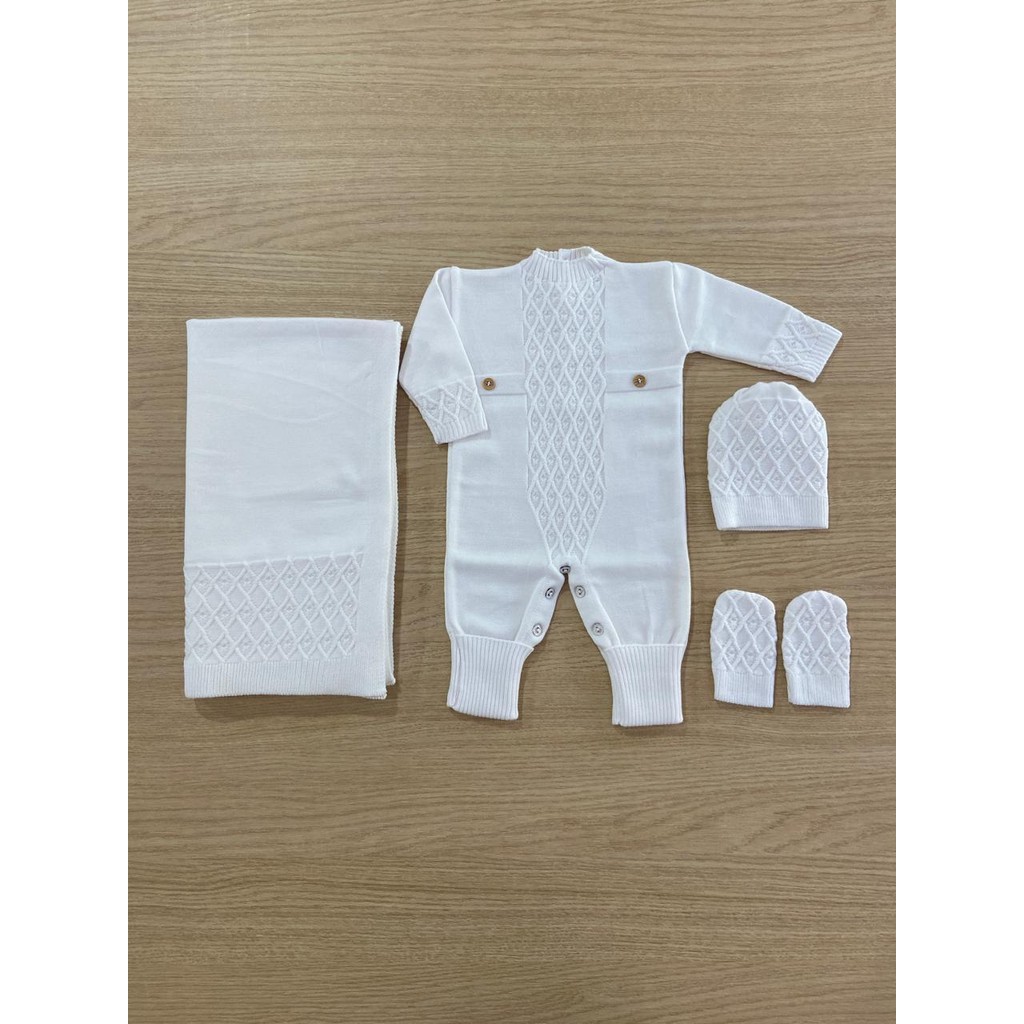 Kit Luxo Macacão Manta Luva Gorro Vira Pé Modal Saída Maternidade Récem Nascido Bebê Tricô