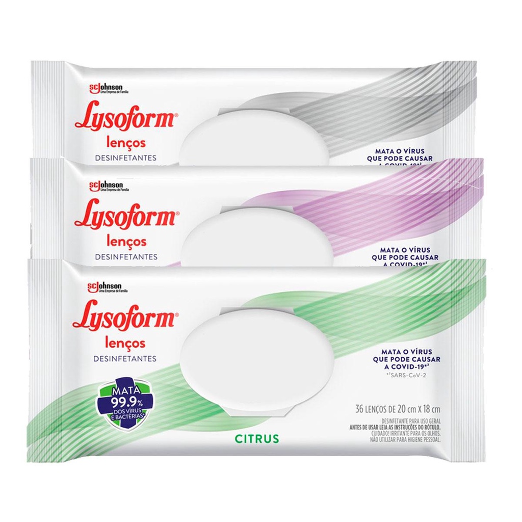 Lenço Umedecido Lysoform é um produto versátil, que mata 99.9% dos vírus, bactérias e fungos, incluindo o vírus que pode causar a COVID-19 (SARS-CoV-2). Ideal para desinfetar e eliminar odores de diversas superfícies, para que você possa aproveitar todos os momentos. Fácil de carregar para todas as ocasiões. Beneficios: • Eficaz contra o SARS-COV 2. • Mantém a casa limpa no cotidiano. • Dispensa o uso de balde, produtos de limpeza, esponja, panos e água. • Torna a sua rotina mais versátil e funcional, deixando a sua casa com cheirinho de limpeza. • Fragrância original. • Disponível com 36 unidades cada embalagem. O Kit contém: 1 pacote de Lenço Umedecido Lysoform Desinfetante Original com 36 unidades. 1 pacote de Lenço Umedecido Lysoform Desinfetante Lavanda com 36 unidades. 1 pacote de Lenço Umedecido Lysoform Desinfetante Citrus com 36 unidades. *Compre produtos Lysoform.