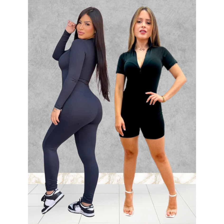 Kit Macacão e Macaquinho Feminino com Ziper Moda Gringa Virginia Feminina Manga Curta e Longa Suplex Liso Academia