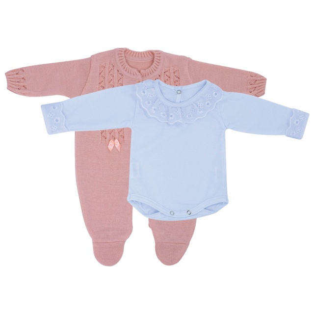 Kit Macacão Laço Rosa e Body com Gola e Punho de Renda