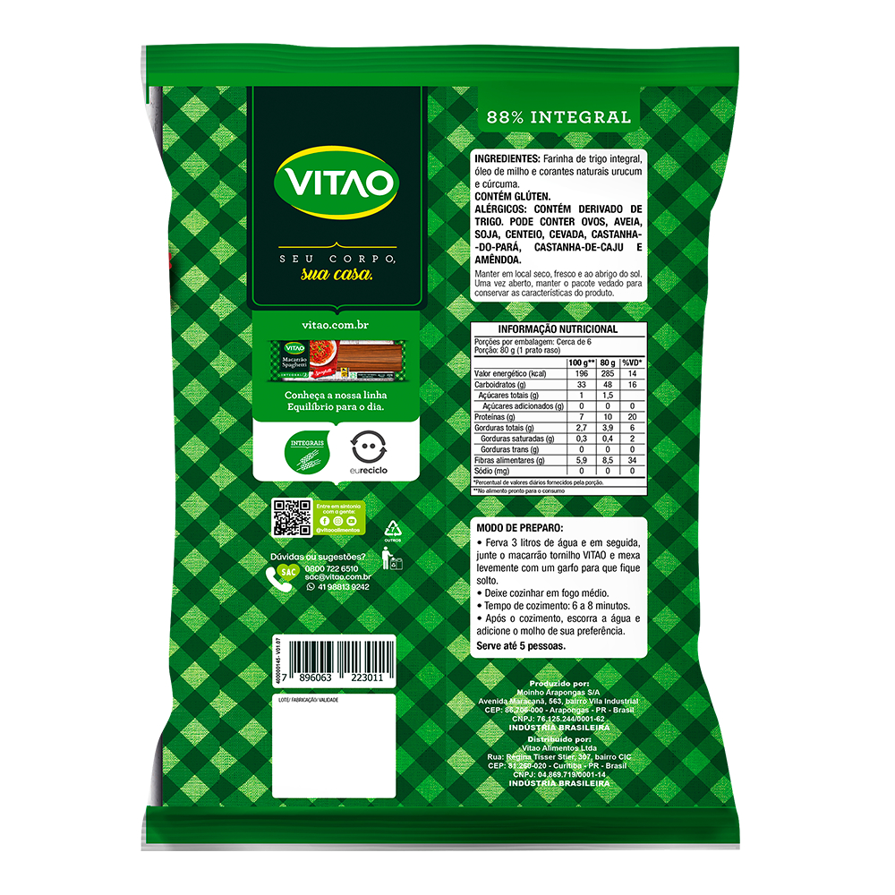 O macarrão Tornilho integral da Vitao é uma opção saudável e saborosa para as suas refeições. Feito com farinha de trigo integral, esse macarrão preserva todos os nutrientes naturais do grão, incluindo fibras, vitaminas e minerais. Sua forma em tornilho permite que o molho se agarre de maneira perfeita, proporcionando uma experiência gastronômica única. MODO DE PREPARO: • Ferva 3 litros de água e em seguida, junte o macarrão tornilho VITAO e mexa levemente com um garfo para que fique solto. • Deixe cozinhar em fogo médio. • Tempo de cozimento: 6 a 8 minutos. • Após o cozimento, escorra a água e adicione o molho de sua preferência. Serve até 5 pessoas. INGREDIENTES: Farinha de trigo integral, óleo de milho e corantes naturais urucum e cúrcuma. ALÉRGICOS: CONTÉM DERIVADO DE TRIGO. PODE CONTER OVOS, AVEIA, SOJA, CENTEIO, CEVADA, CASTANHA- -DO-PARÁ, CASTANHA-DE-CAJU E AMÊNDOA. CONTÉM GLÚTEN. INTEGRAL, RICO EM FIBRAS.
