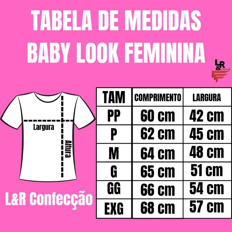 NOSSAS BABY LOOK SÃO CONFECCIONADAS COM MALHA DE ALTA QUALIDADE E POSSUEM ÓTIMO ACABAMENTO COM COSTURA REFORÇADA. GOLA CARECA, MANGA CURTA E BARRA COM ACABAMENTO SIMPLES. NÃO MARCA NO CORPO E GARANTE UM LOOK CONFORTÁVEL E BONITO. SUA PRATICIDADE PERMITE QUE SEJA UTILIZADA EM QUALQUER OCASIÃO. Tecido de alta durabilidade COMPOSIÇÃO: 100% Poliéster antipiling (não junta bolinha) Sem Transparência: Tecido com gramatura de 180g/m², não é transparente. Cores Vivas: Estampa em Sublimação com Cores vivas que não desbotam e não mancham, garantindo a aparência de novo por muito mais tempo. Sem Encolhimento: Após lavar pode secar em tambor (secadora) sem risco de encolhimento. Praticidade: Secagem rápida e resistente ao amarrotamento, sem necessidade de usar ferro de passar roupa. DUVIDAS DE TAMANHO OLHAR NA TABELA! Agradecemos a preferência por nossa peça e garantimos nossa qualidade.