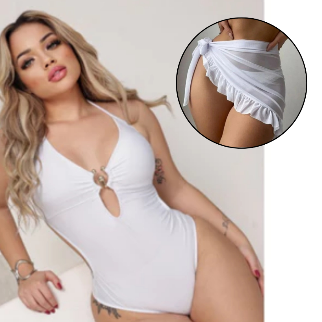 kit Maiô Argola Feminino Costas Nua Novidade Moda 2026 Elegante Promoção + Saia Pareô Curta Saída Praia Envelope