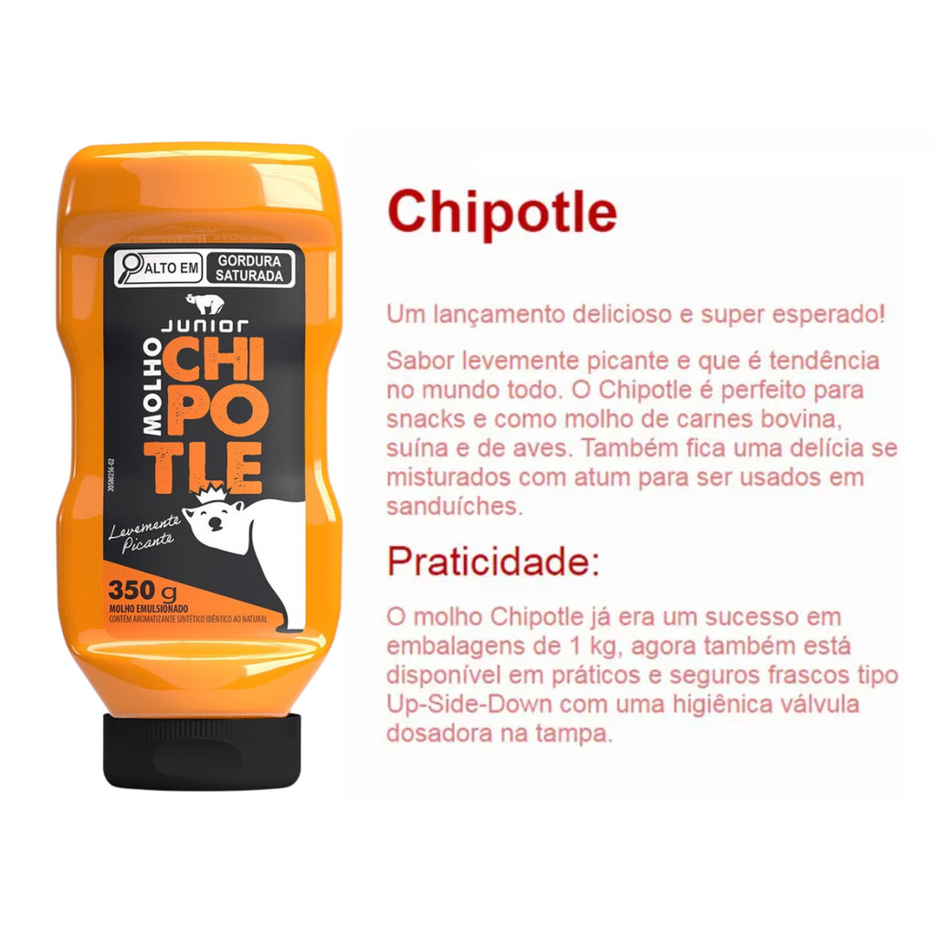 Kit Maionese Grill Chipotle Junior 350g Molho Cremoso Defumado Gourmet Kit Com 2 Unidades Frasco Lanches Fritas Maionese Grill: A Maionese Grill já era um sucesso em embalagens de 1 kg. agora também está disponível em práticos e seguros frascos tipo Upside-Down com uma higiênica válvula dosadora na tampa. - A nova Maionese Grill Júnior é perfeita e saborosíssima atendendo aos paladares mais apurados; - Perfeita para conferir aquele toque grelhado à lanches. fritas. snacks e muito mais. e proporciona sabor e qualidade de sobra; - Muito consumido em lanchonetes e hamburguerias. Chipotle: Apresentando sabor picante na medida certa. o molho Chipotle confere mais personalidade a sua receita. é cremoso e confere sofisticação às saladas. carnes . lanches e como molho de carnes bovina. suína e de aves. - Também fica uma delícia se misturados com atum para ser usados em sanduíches. O produto deve ser conservado em temperatura ambiente. Na utilização pode ser mantido à temperatura ambiente por até 10 horas. Após aberto. ultrapassado o período máximo de 10 horas. o produto deverá ser refrigerado e deverá ser consumido no máximo em 20 dias. ALÉRGICOS: CONTÉM DERIVADOS DE SOJA. NÃO CONTÉM GLÚTEN.