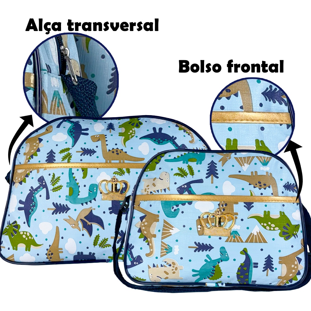 Kit Mala Maternidade 2 Bolsas Impermeável Menino Dinossauro Trocador dobravel conforto Facil Limpeza