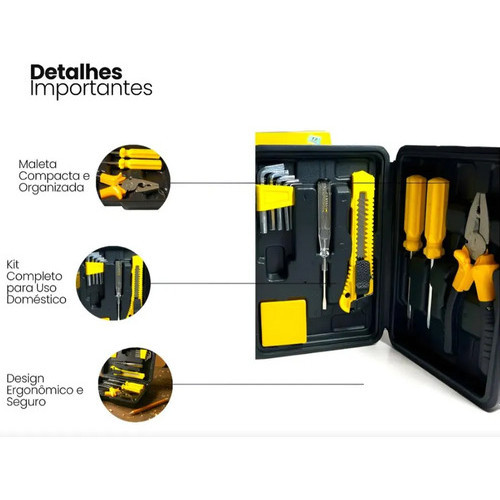 Kit Maleta de Ferramentas com 12 Peças – Completo e Prático O kit maleta de ferramentas com 12 peças é ideal para pequenos reparos, manutenções domésticas e uso diário. Compacto e funcional, reúne as principais ferramentas para facilitar ajustes rápidos em casa, no trabalho ou no carro. Acompanha maleta organizadora, garantindo praticidade no transporte e armazenamento. Indicado para uso residencial, profissional leve ou emergências, este conjunto oferece versatilidade e excelente custo-benefício. PRINCIPAIS CARACTERÍSTICAS: - Kit completo com 8 peças essenciais - Acompanha maleta resistente e organizada - Ferramentas práticas e fáceis de usar - Ideal para manutenção e reparos em geral VANTAGENS DO PRODUTO: - Ideal para uso doméstico e pequenos reparos - Fácil de transportar e armazenar - Organização e praticidade em um único conjunto - Ótima opção para casa, escritório ou presente - Produto novo, pronto para envio. Uma solução completa para quem precisa estar sempre preparado para qualquer reparo.