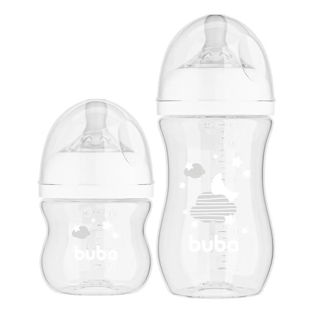 Kit 2 Mamadeiras Buba Easy Flow Anticólica – 120 ml e 270 ml – Nuvem ou Elefantinho O Kit de Mamadeiras Easy Flow Anticólica da Buba foi desenvolvido para oferecer mais conforto, segurança e praticidade na hora da alimentação do bebê. Com um sistema exclusivo de duas válvulas, as mamadeiras ajudam a reduzir a ingestão de ar, prevenindo gases e cólicas. O bico em silicone ultrasoft é supermacio, com textura sedosa que se assemelha ao bico do seio materno, proporcionando uma adaptação mais fácil. Além disso, os bicos estão disponíveis em 4 fluxos diferentes para acompanhar o crescimento do bebê. Diferenciais do Produto Diferenciais do Produto - Sistema anticólicas: duas válvulas que reduzem a ingestão de ar, evitando gases e cólicas - Bico em silicone ultrasoft: supermacio, sedoso e semelhante ao seio materno - Design ergonômico: confortável de segurar, ideal para as mãozinhas do bebê - Vedação segura: evita vazamentos mesmo de cabeça para baixo - Super-higiênica e livre de BPA: bocal largo e cantos arredondados para fácil higienização; pode ser lavada na lava-louças, usada no micro-ondas e esterilizada Indicação Ideal para bebês a partir de 0 meses Medidas Aproximadas (AxLxP) - Mamadeira 120 ml: 12 x 7 x 7 cm - Mamadeira 270 ml: 16 x 7 x 7 cm Composição 85% Polipropileno (PP) e 15% Silicone Conteúdo da Embalagem - 1 mamadeira 120 ml com bico 1 (0+ meses) - 1 mamadeira 270 ml com bico 2 (2+ meses)