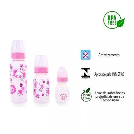 Kit Contém:* 3 Mamadeiras sendo 240ml 140ml 60ml* 2 Escovas para LavagemAs Mamadeiras tem o bico 100% Silicone foi desenvolvida para garantir conforto e praticidade na hora de amamentar e alimentar o bebê. Além de ter um bico de silicone macio e confortável que se adapta à cavidade bucal da criança ela ainda acompanha capuz anti-vazamento. Bico de siliconeFácil de utilizar, limpar e montar.Certificado pelo INMETRO Livre de BPA: não liberam nenhuma substância tóxica no contato com altas temperaturas e podem ir ao freezer, micro-ondas e lava-louças.* Escova de lavar mamadeiras Feita com a ponta em cerdas retorcidas para atingir os cantos mais difíceisTem uma quantidade ideal de cerdas para uma limpeza mais eficienteCabo com opção de pendurar facilitando a utilização dos limpadoresSeca RapidamenteTamanho grande para a Parte interna da Mamadeira e tamanho pequeno para limpar os bicos