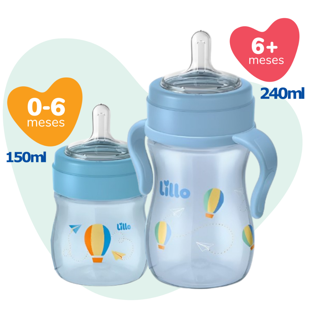 Kit Mamadeiras Lillo Primeiros Passos 150/240 mL Este kit completo e prático foi especialmente desenvolvido para acompanhar o seu bebê em suas primeiras descobertas. Contando com duas mamadeiras de tamanhos diferentes, ele oferece todas as ferramentas necessárias para uma alimentação segura, confortável e divertida. O que o kit inclui: - Mamadeira 150ml (0-6 meses): Perfeita para os primeiros meses de vida do seu bebê, essa mamadeira possui um bico reto de silicone macio, ideal para a sucção natural e o desenvolvimento bucal saudável. Seu design ergonômico facilita a pega e o manuseio pelos pais. - Mamadeira 240ml (+6 meses): À medida que o seu bebê cresce e começa a explorar o mundo com as mãos, essa mamadeira se torna a companheira ideal. Com alças ergonômicas e antiderrapantes, ela proporciona maior autonomia para o bebê durante a alimentação. O bico reto, também em silicone macio, garante um fluxo suave e confortável. Características do produto: - Material: Todas as peças são feitas com material de alta qualidade, livre de BPA, garantindo a segurança e a saúde do seu bebê. - Bico: Os bicos retos em silicone são macios e flexíveis, proporcionando uma sensação natural durante a amamentação. - Alças (Mamadeira 240mL): As alças ergonômicas facilitam a pega e o manuseio da mamadeira, incentivando a autonomia do bebê. - Tampa: A tampa antivazamento garante que a mamadeira possa ser transportada com segurança, evitando acidentes. - Design: O design moderno e divertido, com estampas de borboletas e corações, torna a hora da mamada ainda mais prazerosa. Benefícios do produto: - Facilita a transição da amamentação para a mamadeira: O bico reto e macio imita o formato do seio materno, facilitando a adaptação do bebê. - Promove o desenvolvimento oral: A sucção natural estimula o desenvolvimento dos músculos da boca e da língua, preparando o bebê para a mastigação. - Incentiva a autonomia: As alças ergonômicas (Mamadeira 240mL) permitem que o bebê segure a mamadeira sozinho, desenvolvendo a coordenação motora e a independência. - Seguro e higiênico: O material livre de BPA e a fácil limpeza garantem a segurança e a higiene do produto. Conteúdo da Embalagem: 01 - Mamadeira 150ml (0-6 meses); 01 - Mamadeira 240ml com alças (+6 meses).
