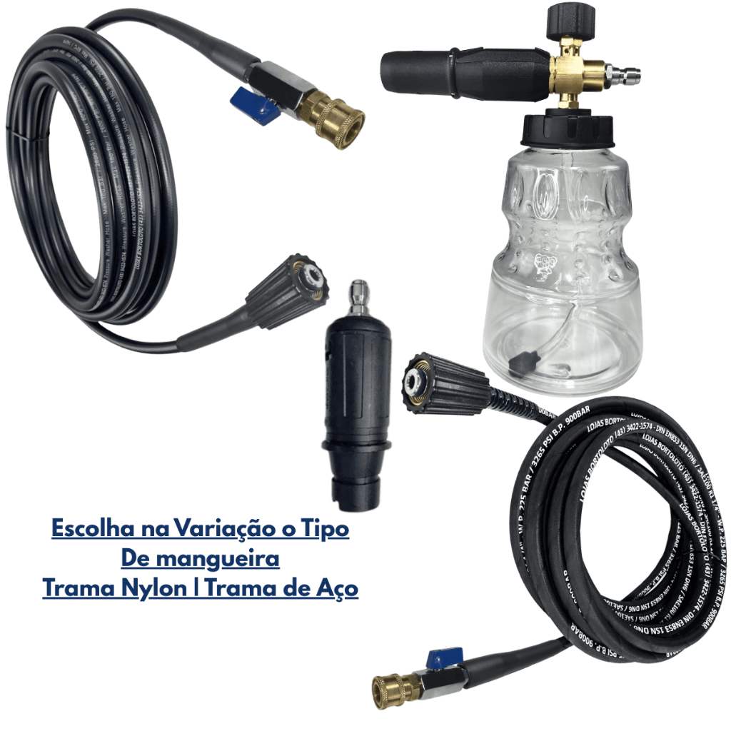 KIT COMPLETO MANGUEIRA TRAMA DE NYLON OU AÇO + SNOW FOAM PARA LAVADORA DE ALTA PRESSÃO DOMESTICA PADRÃO M22-14 PARA KARCHER O kit inclui: Bico curto com jato regulável (reto e leque) com engate rápido; Mini registro abre/fecha com engate rápido; Mangueira de alta pressão com trama de nylon ou aço super resistente; Snow foam de excelente qualidade com engate rápido; Compatível somente com lavadoras de alta pressão especificadas no anúncio. Características do Kit • Bico Curto: Ideal para locais pequenos e de difícil acesso, permitindo direcionar o jato com precisão. Possui 2 modos de jato: Reto (concentrado): indicado para limpezas pesadas; Leque (vassourinha): ideal para limpezas leves e rápidas. • Mini Registro: Ao fechar, aciona o sistema “stop total” da lavadora, permitindo troca rápida de acessórios com segurança. • Mangueira com Trama de Nylon ou Aço Interna: Fabricada especialmente para lavadoras de alta pressão. Resistente, flexível e durável, que evita rachaduras e protege contra abrasão, óleo e intempéries. Obs: Conectores/manoplas podem ter aparência diferente da original, mas possuem medidas e roscas compatíveis com o modelo informado. • Snow Foam: Alta eficiência em produção de espuma. Possui regulagem de jato leque e controle da quantidade de shampoo, garantindo melhor aproveitamento do produto. Ideal para uso geral, principalmente na lavagem automotiva. Informações adicionais Produto novo, com garantia e envio imediato. Garantia 90 dias para defeitos de fabricação. (Não cobre danos por mau uso.)