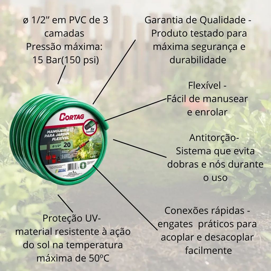 Mangueira de Jardim Cortag Verde 1/2" com Acessórios. Mangueiras de Jardim de alta resistência com flexibilidade avançada, desenvolvidas para garantir durabilidade e desempenho superior em aplicações residenciais e projetos de paisagismo profissional. Tecnologia que alia robustez e facilidade de manuseio, ideais para uso constante e exigente. Diferenciais: - Proteção UV; - Flexibilidade; - Durabilidade. Conteúdo da embalagem: - 20 metros de mangueira; - 1 Esguicho regulável; - 2 engates rápidos; - 1 Bico adaptador. Garantia de fábrica: 3 meses