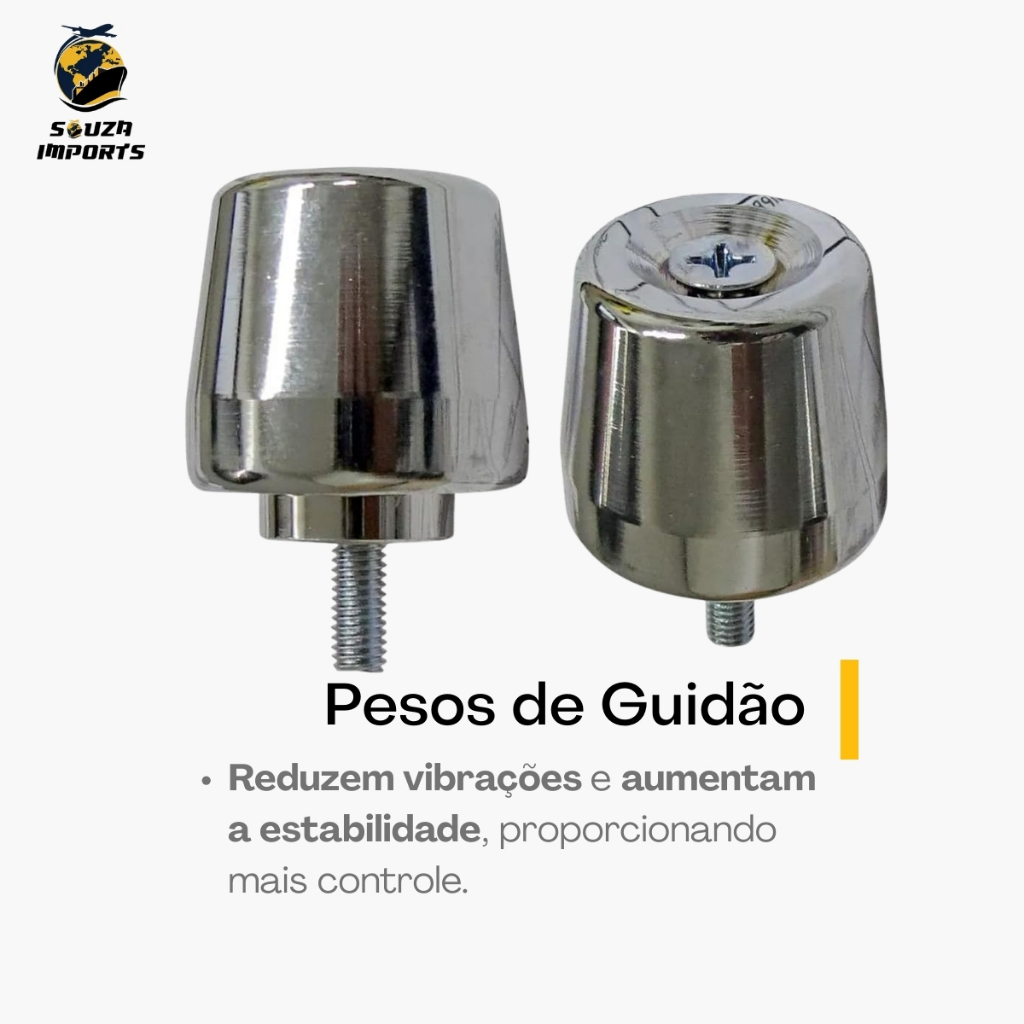 Kit Premium: Manoplas Cargo 160 + Pesos de Guidão PCX Cromados Melhore o visual e a pilotagem da sua moto com este kit completo da Souza Imports. A combinação perfeita entre o conforto anatômico do modelo Cargo e a estabilidade dos pesos de guidão. Destaques do Produto: Ergonomia Superior: Design Cargo 160 que oferece pegada firme e descanso para a mão. Estabilidade: Pesos de guidão que ajudam a reduzir as vibrações do motor, garantindo uma viagem mais suave. Acabamento Premium: Pesos cromados de alto brilho e borracha resistente. Praticidade: Manopla já vem com a roldana do acelerador integrada. Compatibilidade (Motos Honda com rosca/suporte no guidão): Honda CG Titan (125, 150, 160) Honda CG Fan (125, 150, 160) Honda CG Start (150, 160) Honda PCX 150 Honda XRE (190, 300) Honda CB Twister 250 Honda Biz (100, 110, 125) Honda Pop (100, 110) Especificações Técnicas: Material Manopla: Borracha texturizada com roldana plástica. Material Peso: Aço com banho cromado de alta resistência. Cor: Manopla Preta / Peso Cromado. O que você recebe: - 01 Par de Manoplas Cargo 160 (Esquerda + Direita com Roldana). - 01 Par de Pesos de Guidão modelo PCX. Parafusos para fixação dos pesos. Importante: Sua moto precisa ter o suporte interno (rosca) no guidão para fixação dos pesos. Verifique antes da compra! Envio Imediato! Garanta mais conforto e estilo para sua rodagem hoje mesmo.