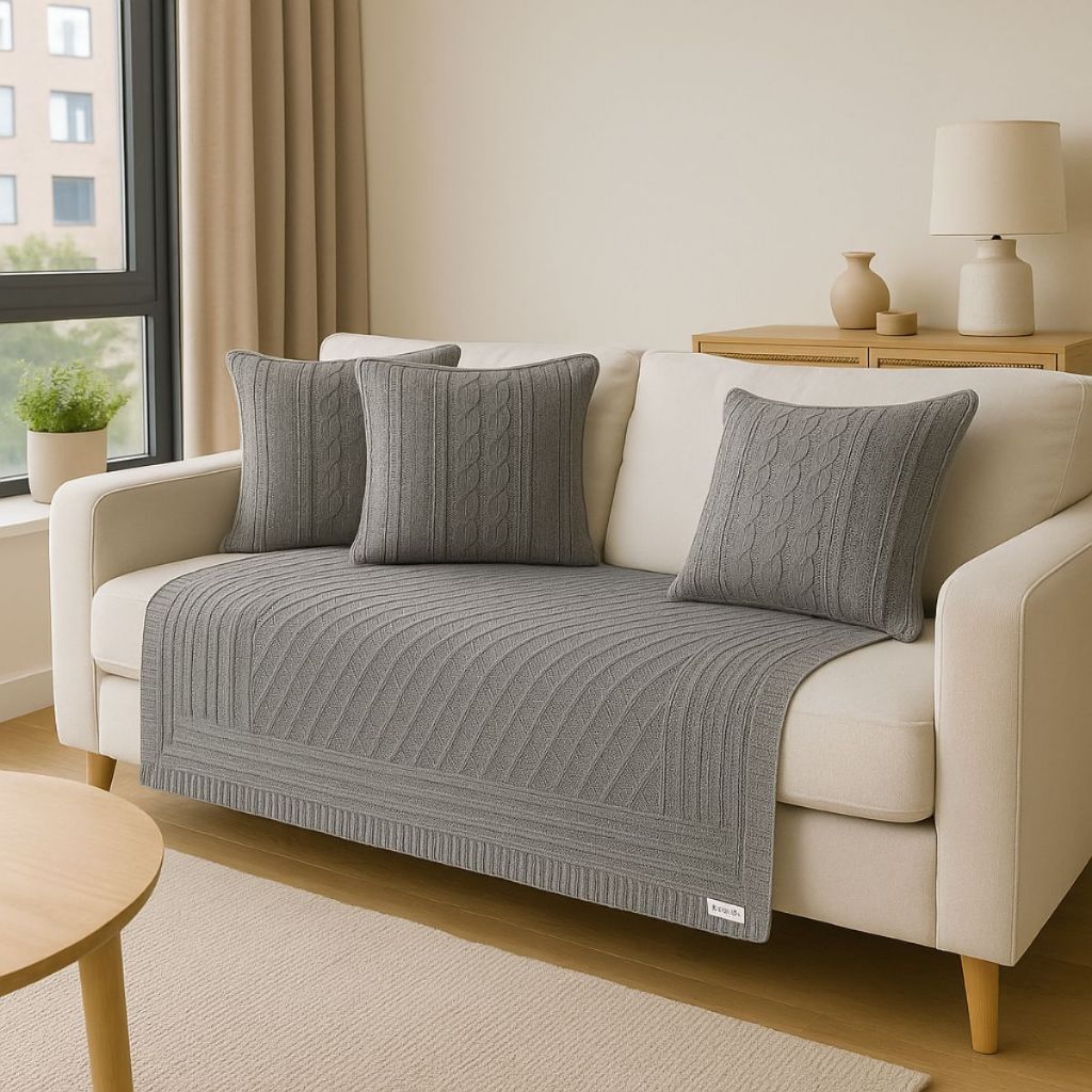 Kit Manta Tricot Californian Style Luxo 3D Tranças + 2 Capas de Almofada Sofá e Cama